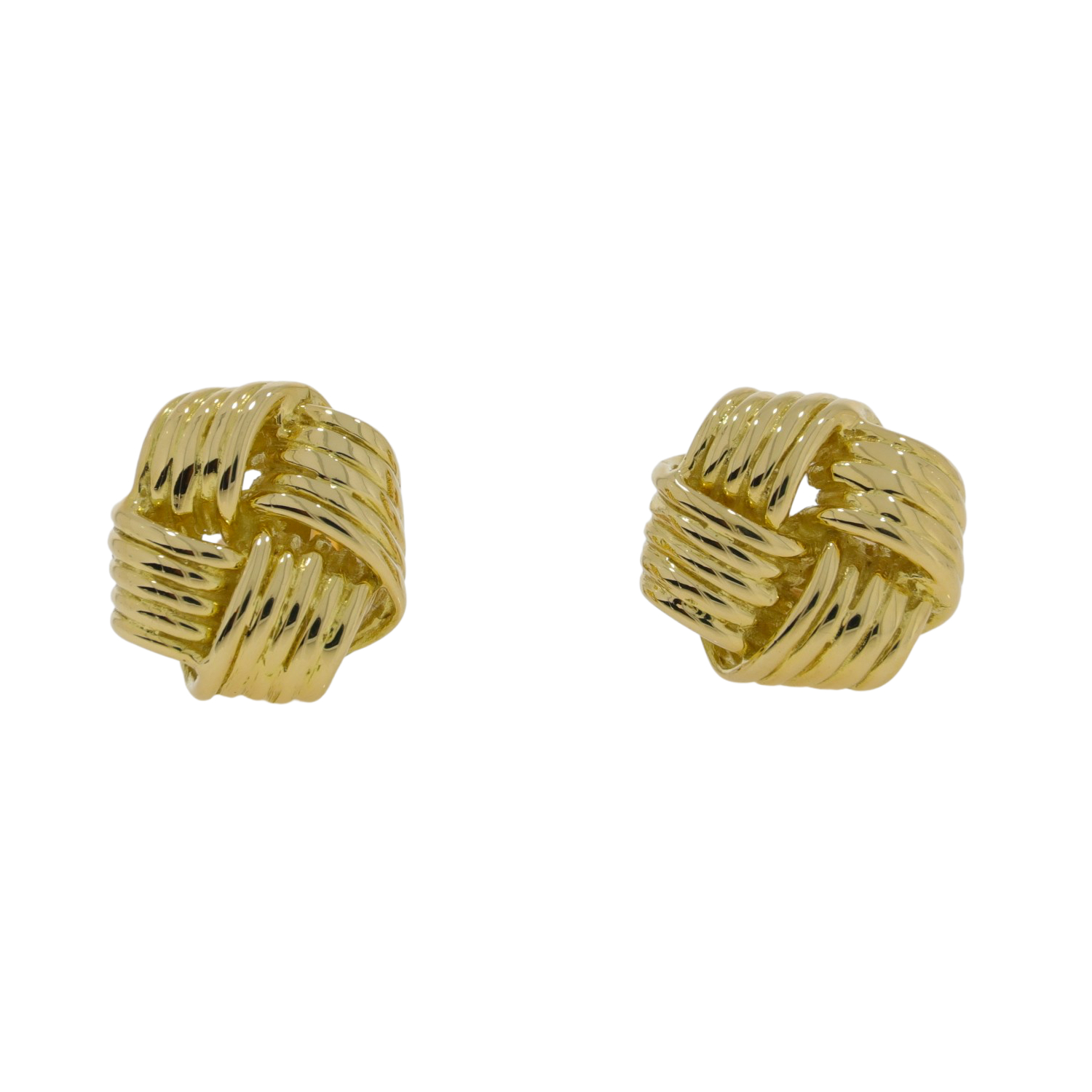 A classical pair of 18ct yellow gold knot earrings, made of a four section woven knot, with each weave made up of a five row grooved pattern. The earrings re secured with 18ct gold posts, and handmade 9ct yellow gold butterflies that are extra heavy to support the weight of the earrings when being worn.