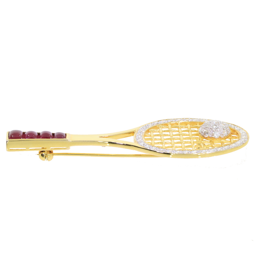 A very stylish brooch made in the form of a Tennis Racquet. The racquet is bordered with brilliant cut diamonds, and the ball is domed to give a 3D look, is also encrusted with diamonds. The strings of the racquet are made in gold and all woven to give a very realistic look.
