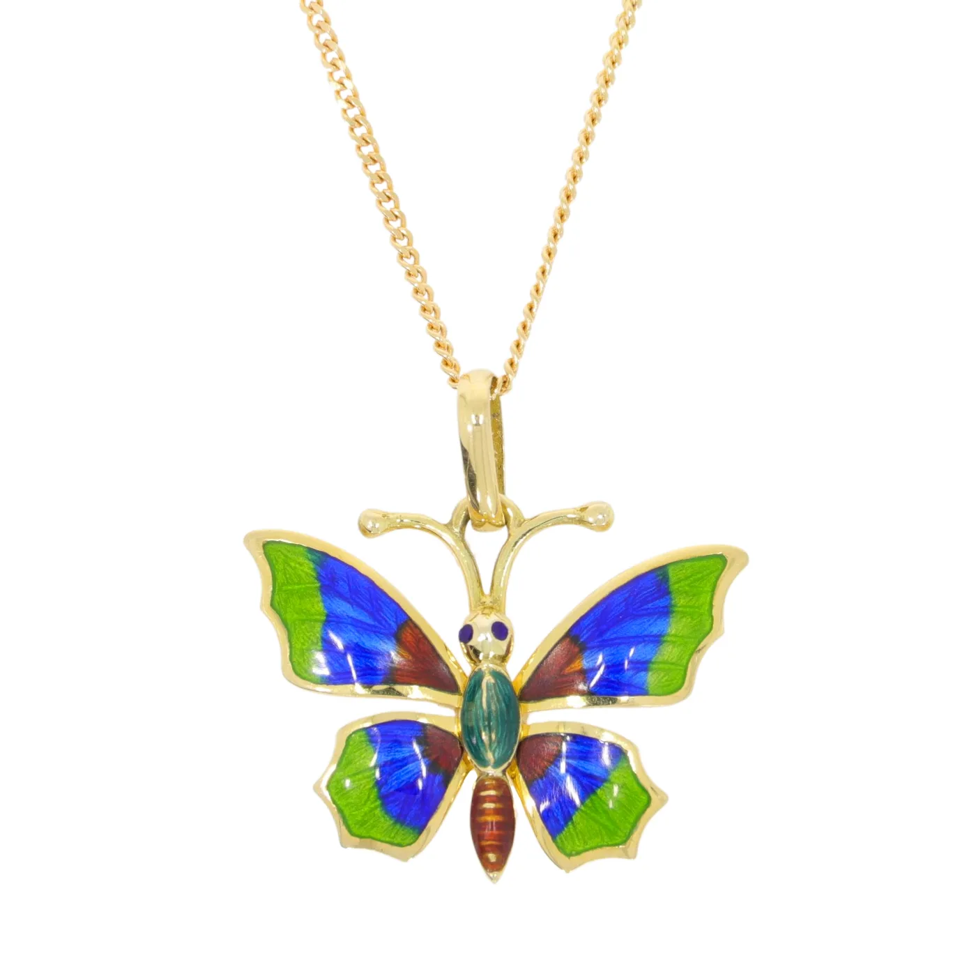 A beautiful and pretty butterfly pendant, made with 9ct yellow gold and then enamelled in varying shades of bright vibrant colours. This particular one has green, blue and crimson wings, suspended from a yellow gold loop on a 9ct gold flattened curb link necklet.