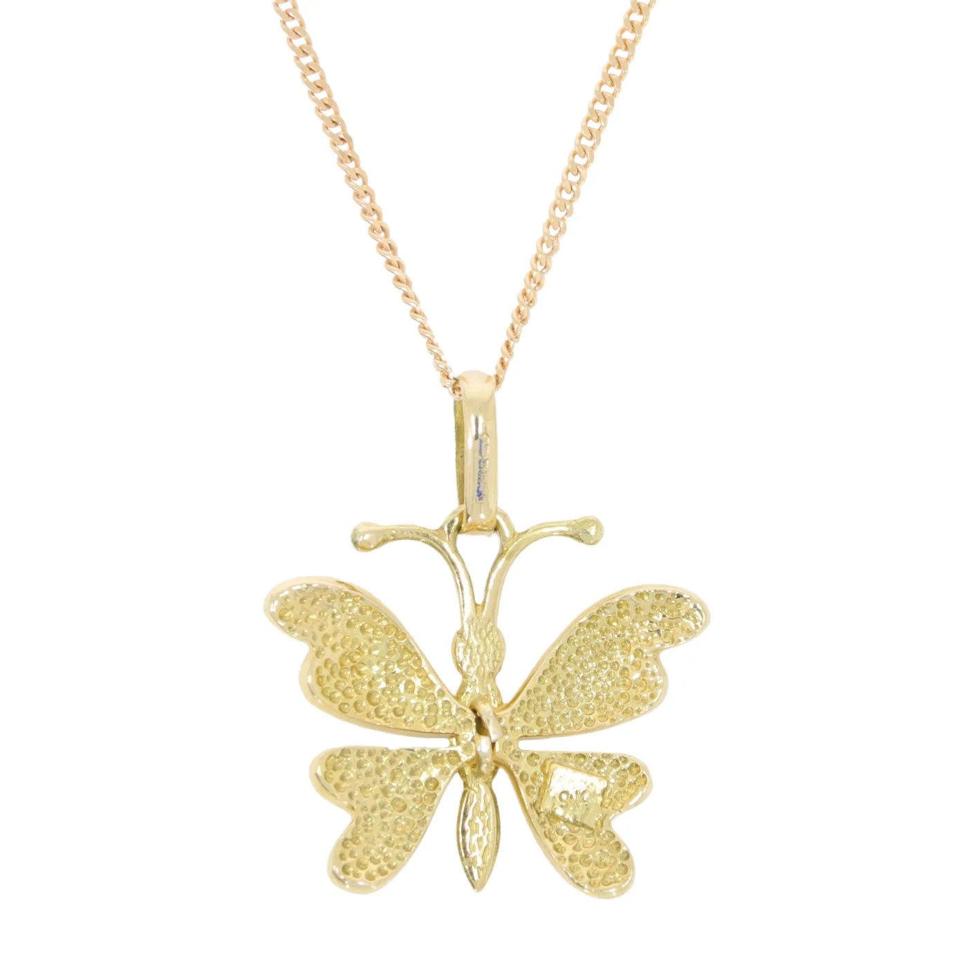 A beautiful and pretty butterfly pendant, made with 9ct yellow gold and then enamelled in varying shades of bright vibrant colours. This particular one has green, yellow and orange wings, suspended from a yellow gold loop on a 9ct gold flattened curb link necklet.
