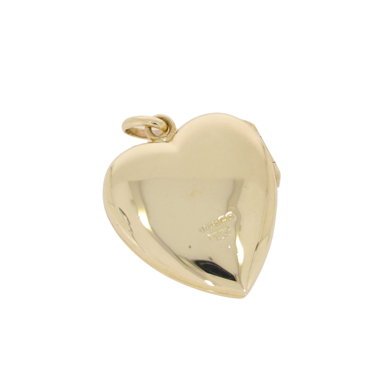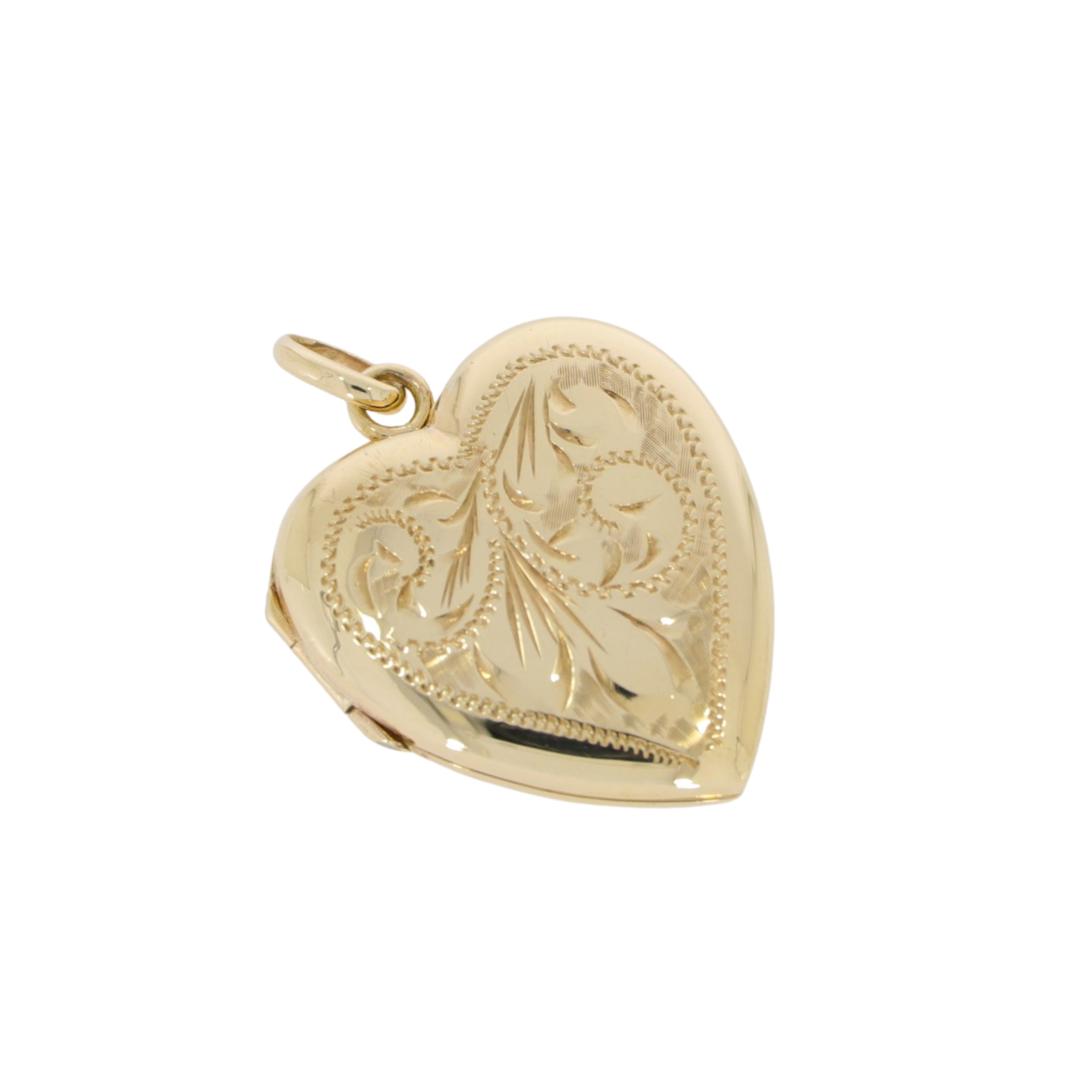 9ct yellow gold heart shaped locket with hand engraved patterned front. Opens and closes very well with a strong definite snap.