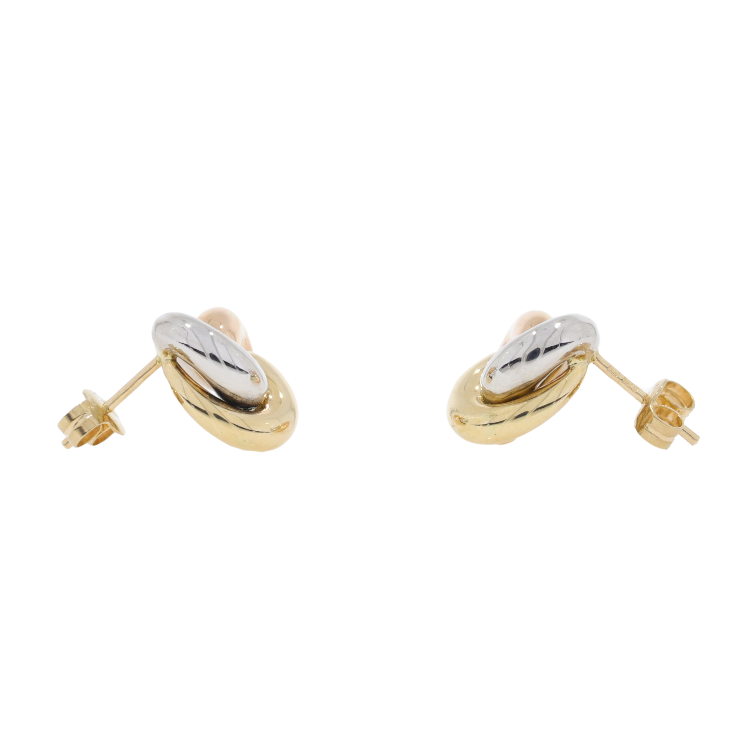 A pair of polished 9ct three colour gold knot earrings, in rose, yellow and white gold. Made of three curving sections in each colour graduating from the centre outwards. Made so that when worn, they are a mirror image of each other and secured with traditional post and butterfly fittings.