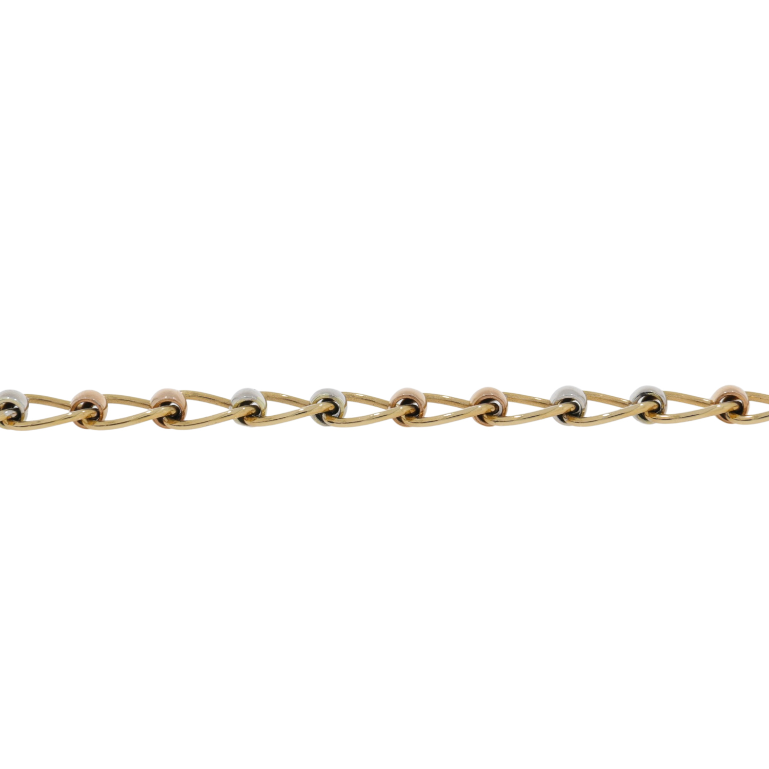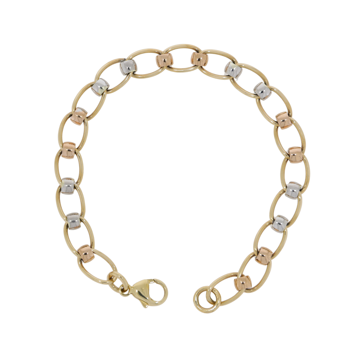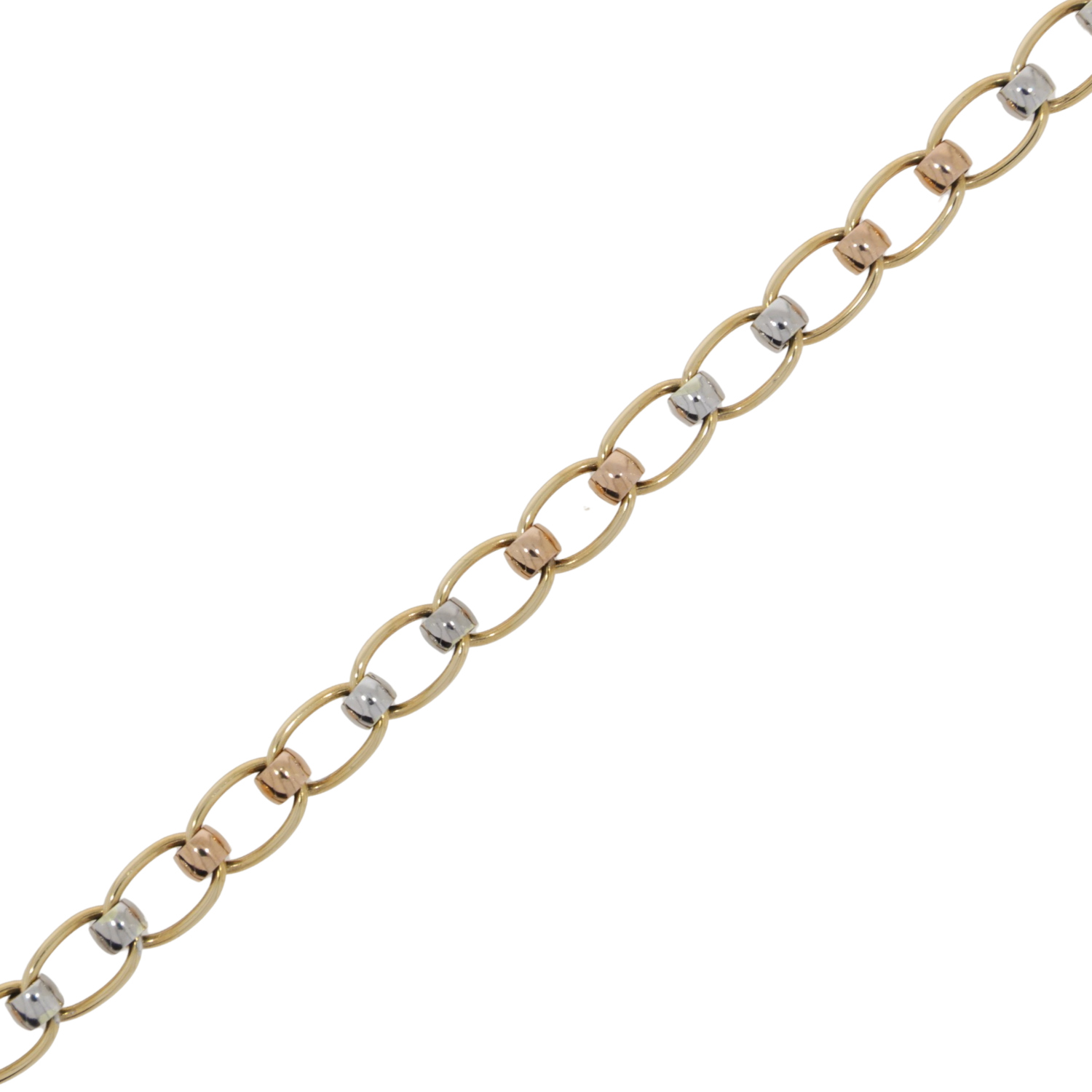 A handmade English bracelet, with 9ct yellow gold open oval links, with pairs of alternating 9ct rose gold and 9ct white gold revolving roller links.