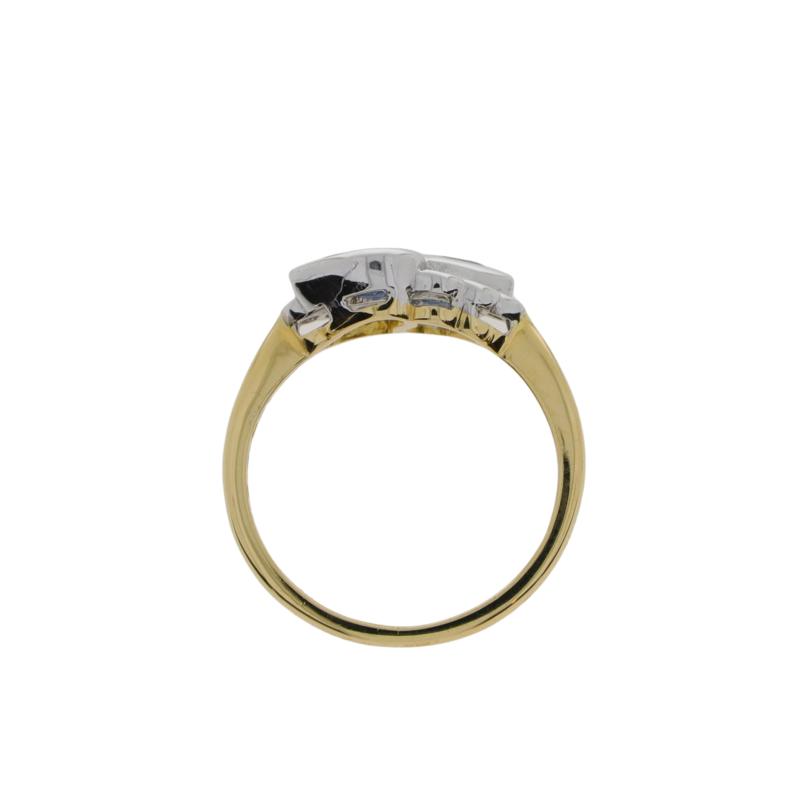 A style of ring that was evocative of the maker Cropp & Farr. They were a superb family manufacturer who made beautiful coloured gemstone rings. This being style ref N9408. With pair of pendeloque cut aquamarines set in opposing directions and held in a smooth rub over 18ct white gold mount, and flanked above and below with three modern brilliant cut diamonds also set in the smooth 18ct white gold rub over mount and finished with a lustrous 18ct yellow gold shank.