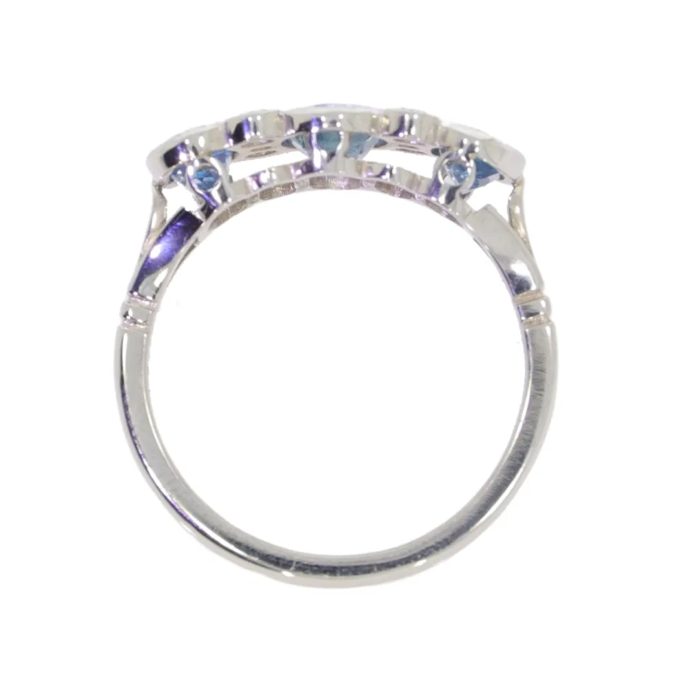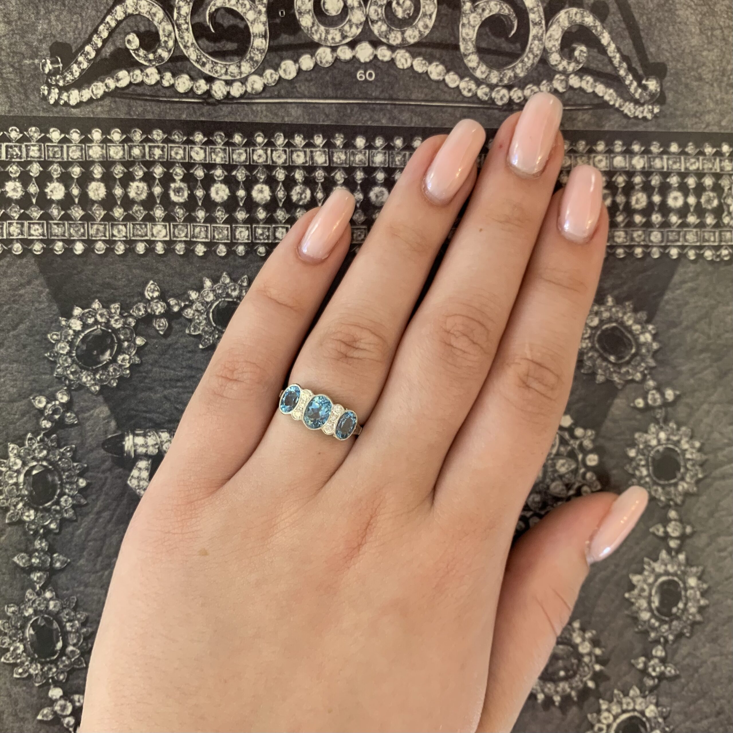 Aquamarine and diamond nine stone ring, with three large oval cut aquamarines, the central slightly bigger than the outer pair. All three a bright, well matched, vibrant aquamarine, and interspaced by 3 modern brilliant cut diamonds. Following the curvature of the ovals, the middle diamond is slightly smaller and the other two diamonds are much bigger to fill in the space between the aquamarines. All the mounting is surely made in platinum with a millegrain finish. The shank joins in a traditional split leaf and shoulder style finish.