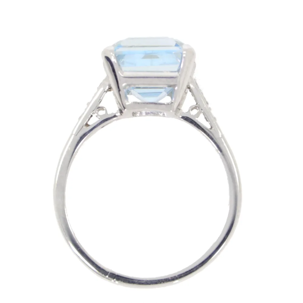 Aquamarine single stone ring, with diamond set shoulders. The square cut Aquamarine, is a bright vibrant stone which we have had re-polished. It is held in a 4 claw platinum setting, with an open gallery to view the full depth of the stone. The shoulders are set with 3 x 8 cut diamonds on each side, this is very typical of a ring made circa 1950. The shank joins the setting with chenier tubing in the split. The shank is made from 18ct white gold.