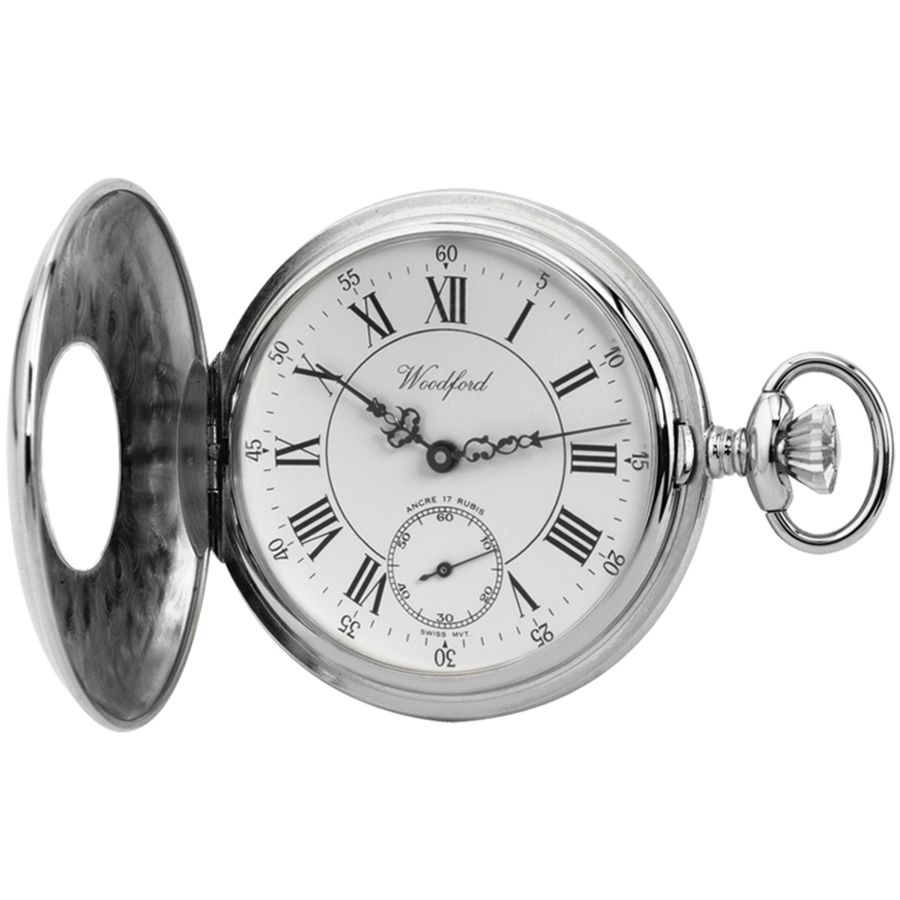 A modern Chrome plated Half Hunter pocket watch by Woodford. The Swiss Made 17 Jewel Lever movement is cased in a highly polished case. The case has curved edges on both the front and back and is fitted with the Demi Glass in the centre with Roman Numerals allowing the time to be read without the need to open the cover. The clear white dial has black roman Numerals and numerical 5 minute markers with fine black filigree hands. A separate seconds dial is positioned at 6 o'clock with a simple black hand.