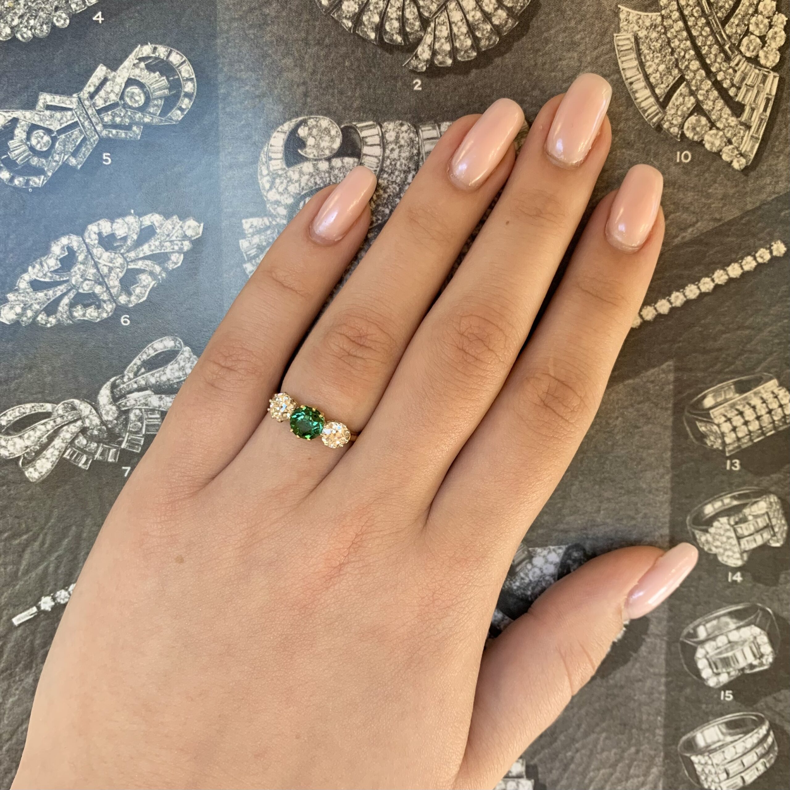 - Chrome Tourmaline and diamond three stone ring, platinum and 18ct gold mount