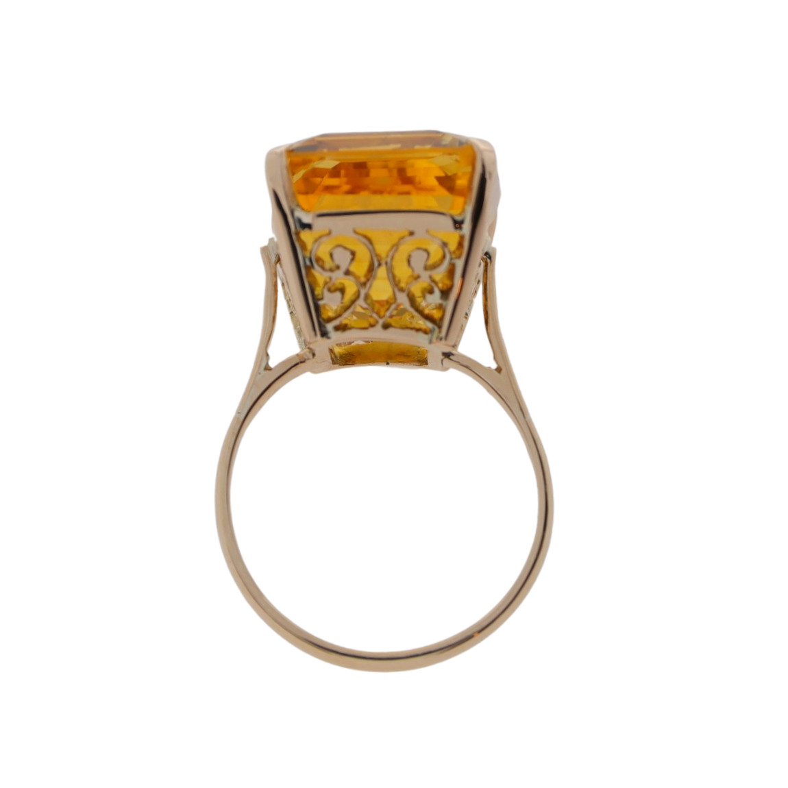A large emerald cut citrine mounted very individually with a hand pierced mount all the way around. The citrine is held in place with 4 claws in the corners, and all mounted in 14K rose gold. The inside of the shank stamped 14K.
