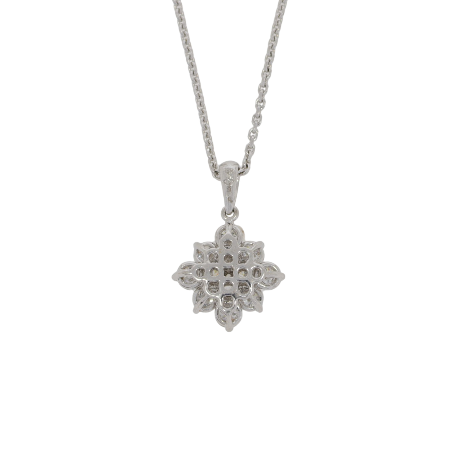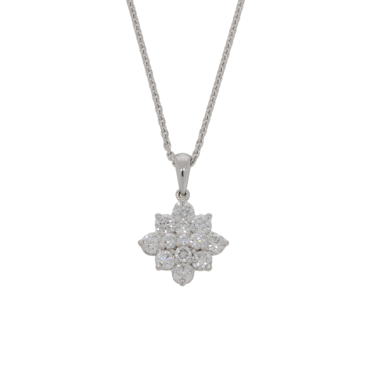 A bright display of a Diamond square cluster pendant, with a central cluster made up of 4 equal sized modern brilliant cut diamonds, with a fifth smaller diamond in the centre. This is surrounded by 8 much larger modern brilliant cut diamonds, all neatly held in 18ct white gold claw settings, and suspended freely from a neat V shaped loop, and on an 18ct white gold trace necklet with a bright finish.