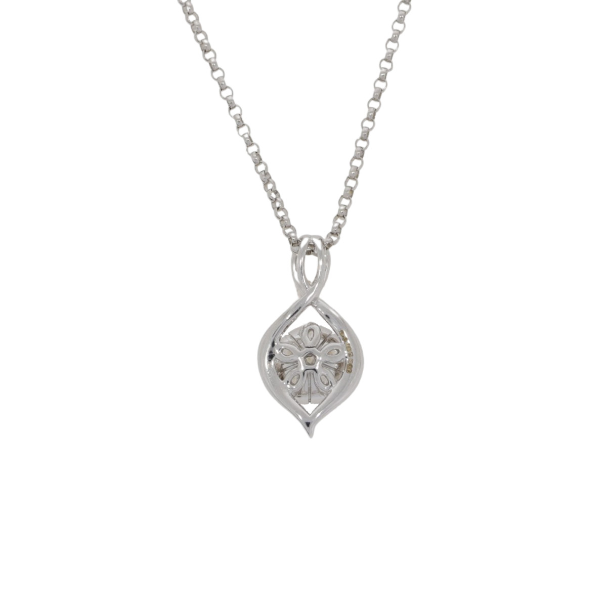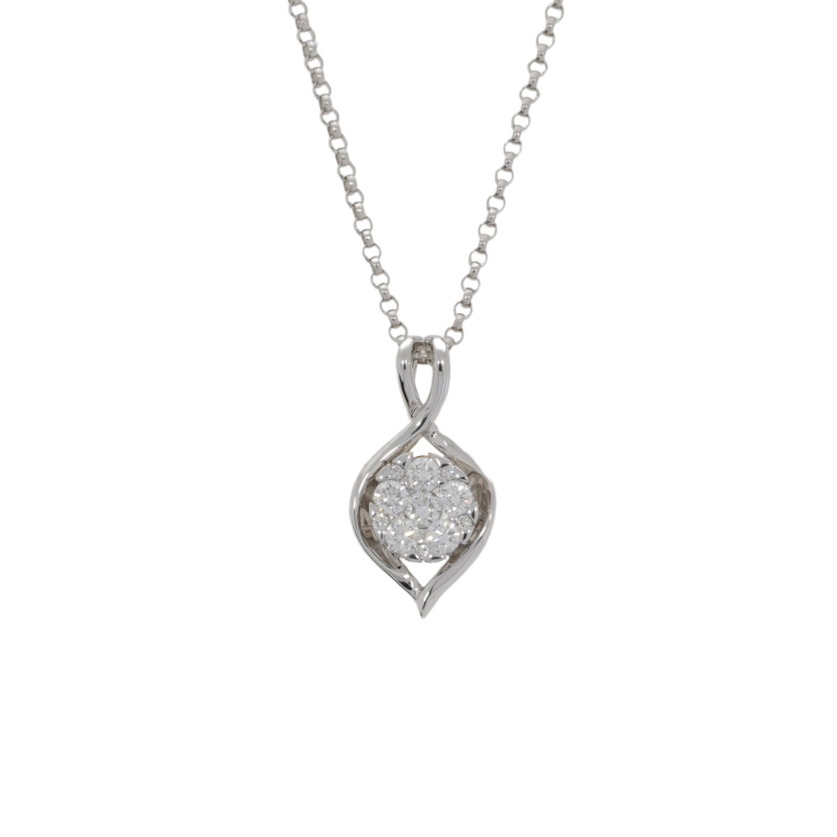 A circular diamond cluster pendant with a fancy 18ct white gold surround mount and necklet. The diamond cluster has a central diamond surrounded by five diamonds and a further five small diamonds points surround this and with the neat claw settings give the circular shape. The mount is made in 18ct white gold with a fancy figure of 8 surround which incorporates a fixed twin wire pendant loop for the 18ct white gold trace necklet (18″) to pass through.