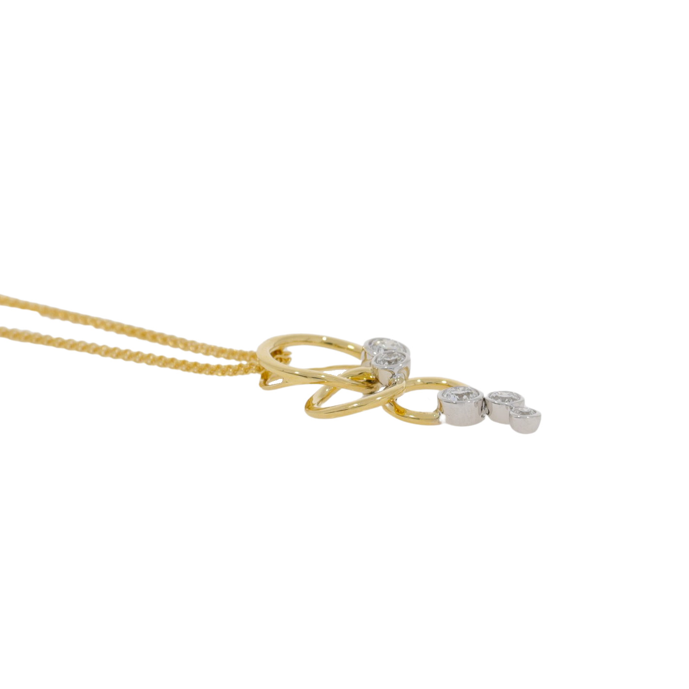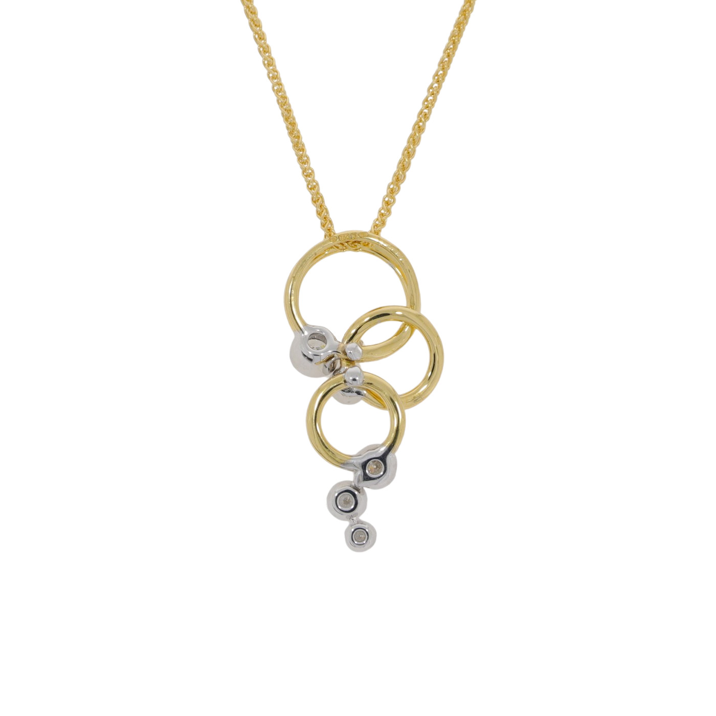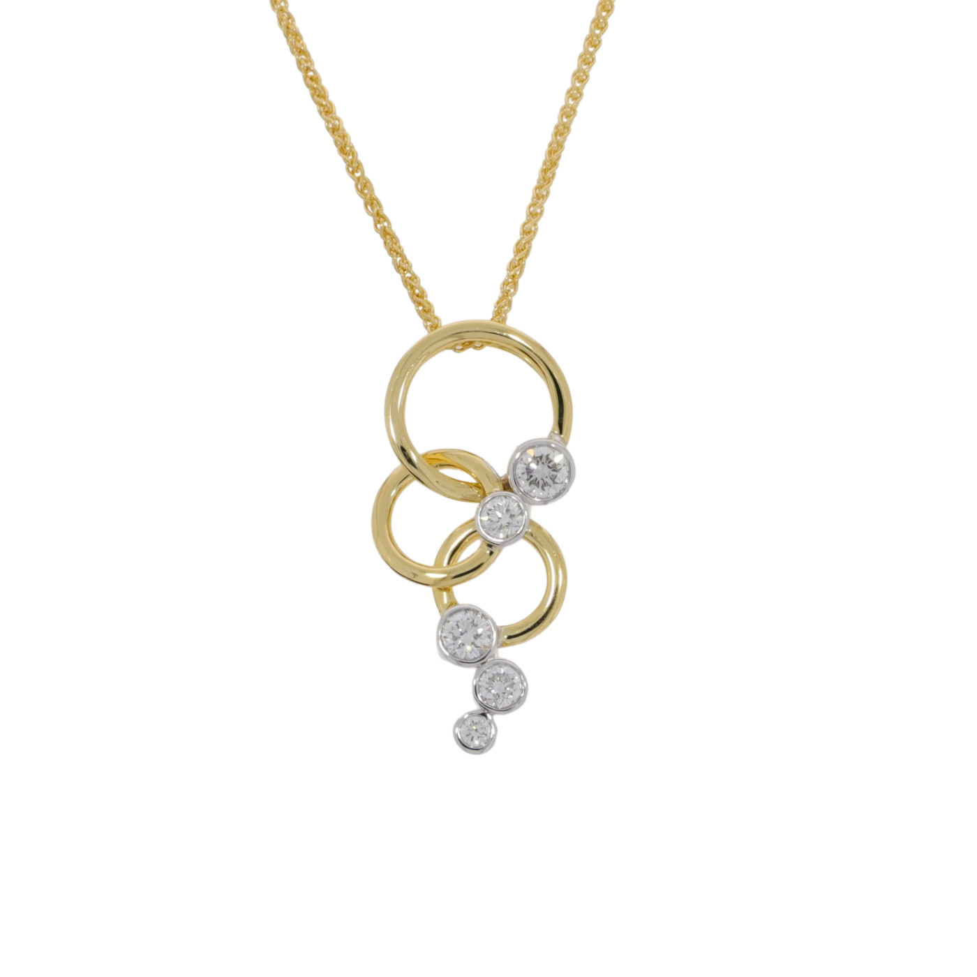 A striking diamond five stone modern pendant. The 5 modern brilliant cut diamonds all set in 18ct white gold rub over settings, are spaced in a random cascading feature, suspended between 3 18ct yellow gold rings, with one larger than the other two, as they drop down. All the rings are free to move which allows the pendant to articulate when being worn. The pendant is on an 18ct yellow gold entwined necklet 18 inches long – 45 cms