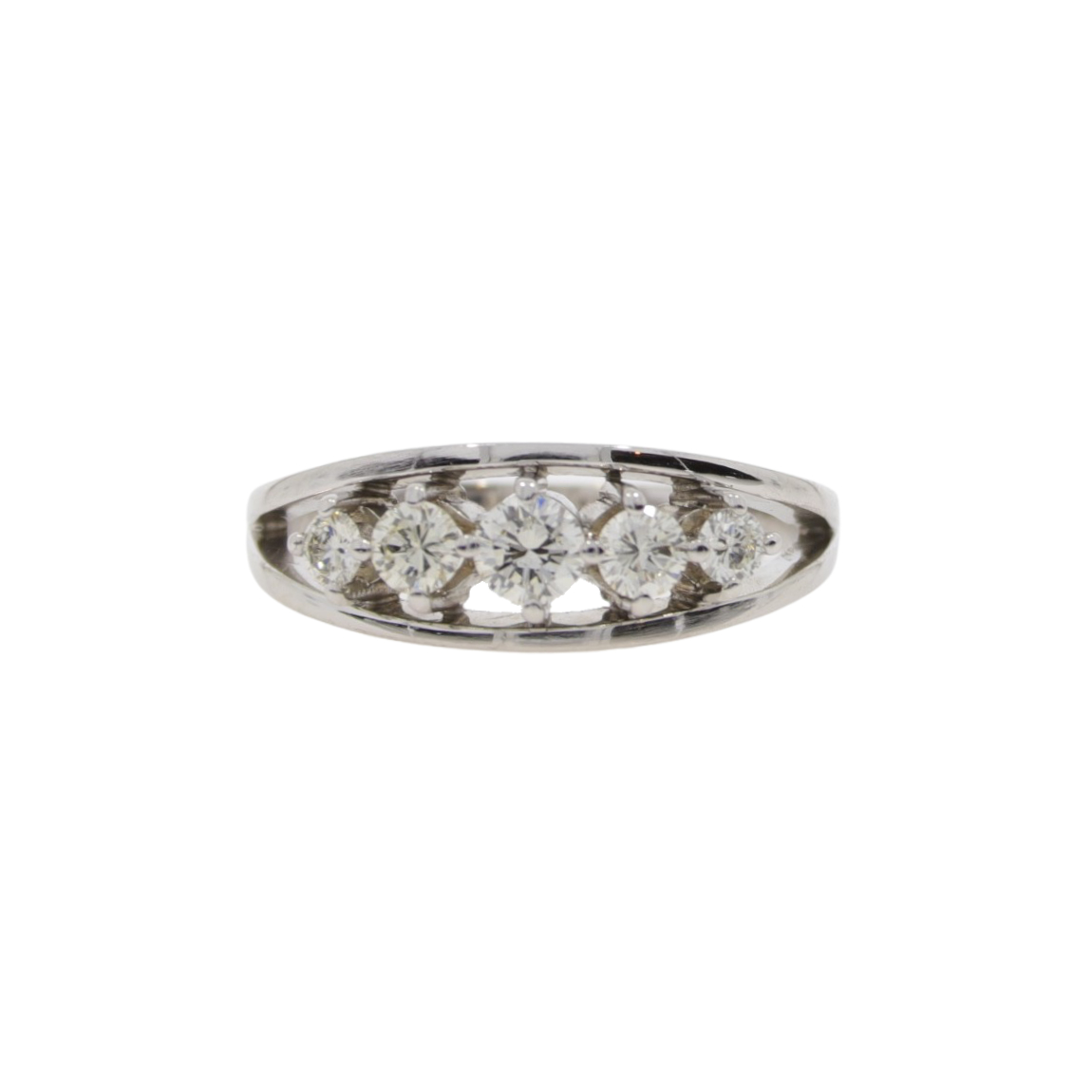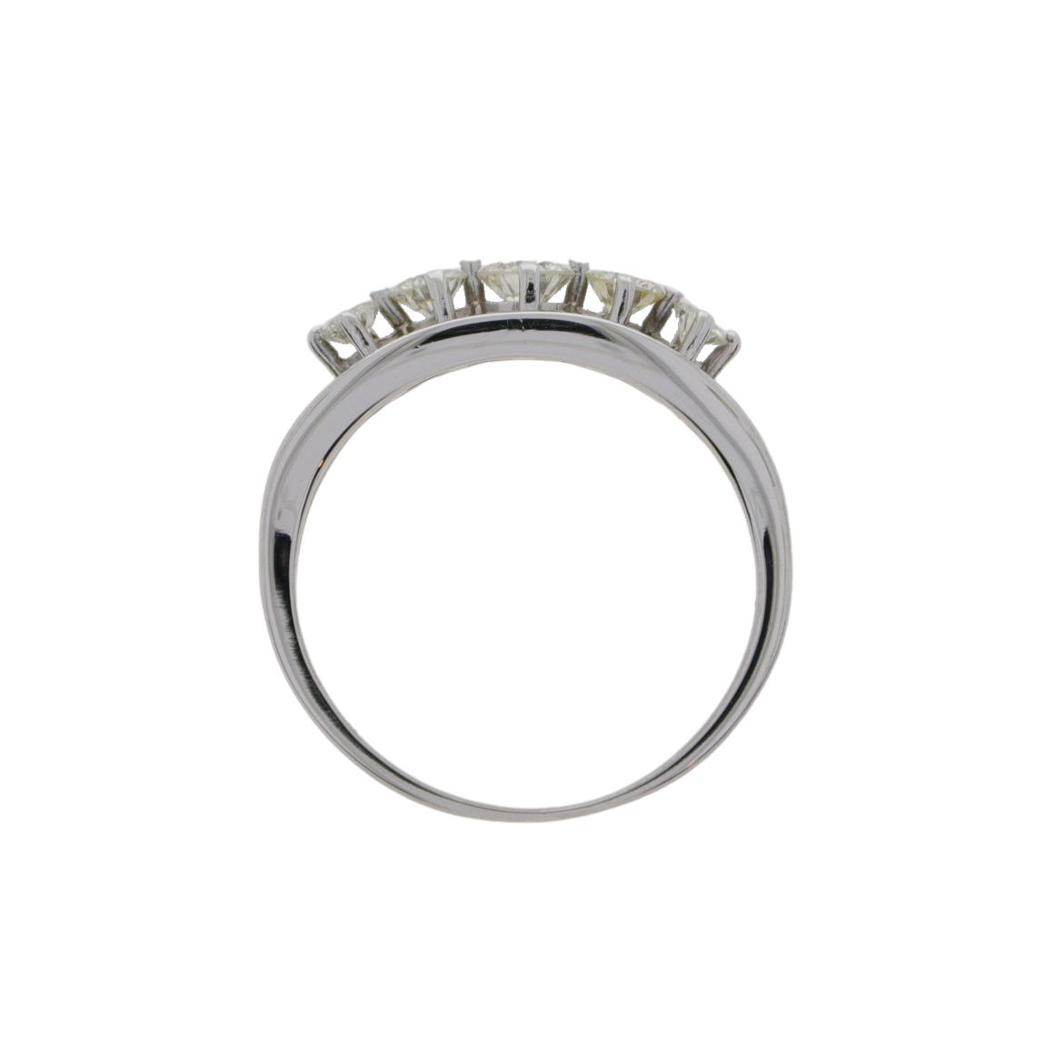 A graduated modern brilliant cut diamond five stone ring, all the diamonds being firmly held in 4 claw settings with the claws at the compass points. These five diamonds sit slightly above the split shank in 18ct white gold.