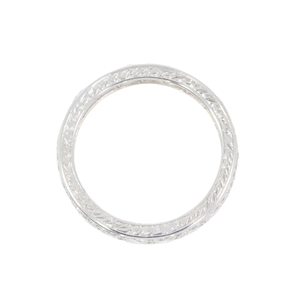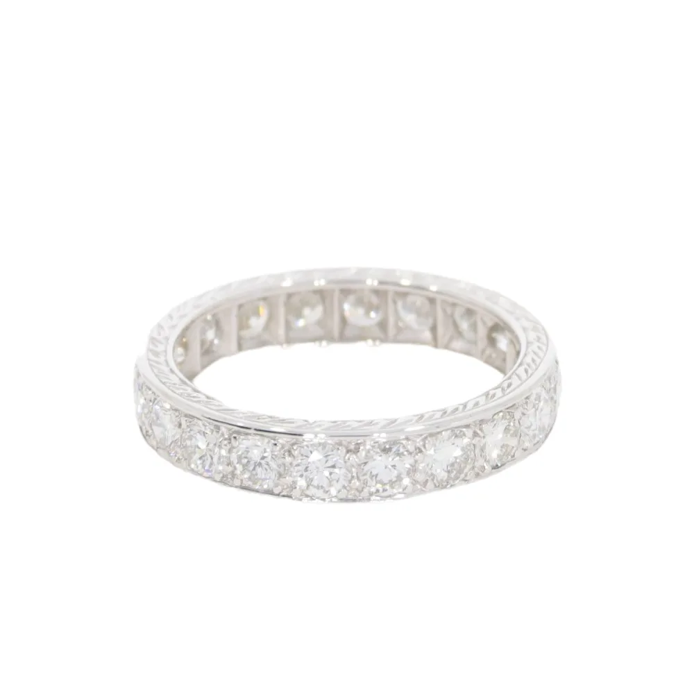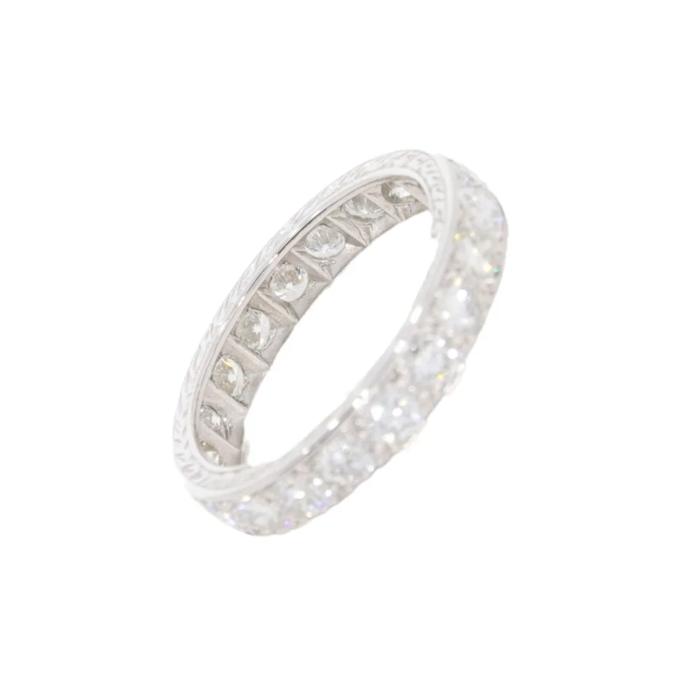 A diamond full eternity ring with twenty brilliant cut diamonds mounted in all platinum. The diamonds are held with very neat discreet claws within a channel setting and each diamond has it’s own individual setting which can be seen from inside the ring. The platinum sides are beautifully engraved.