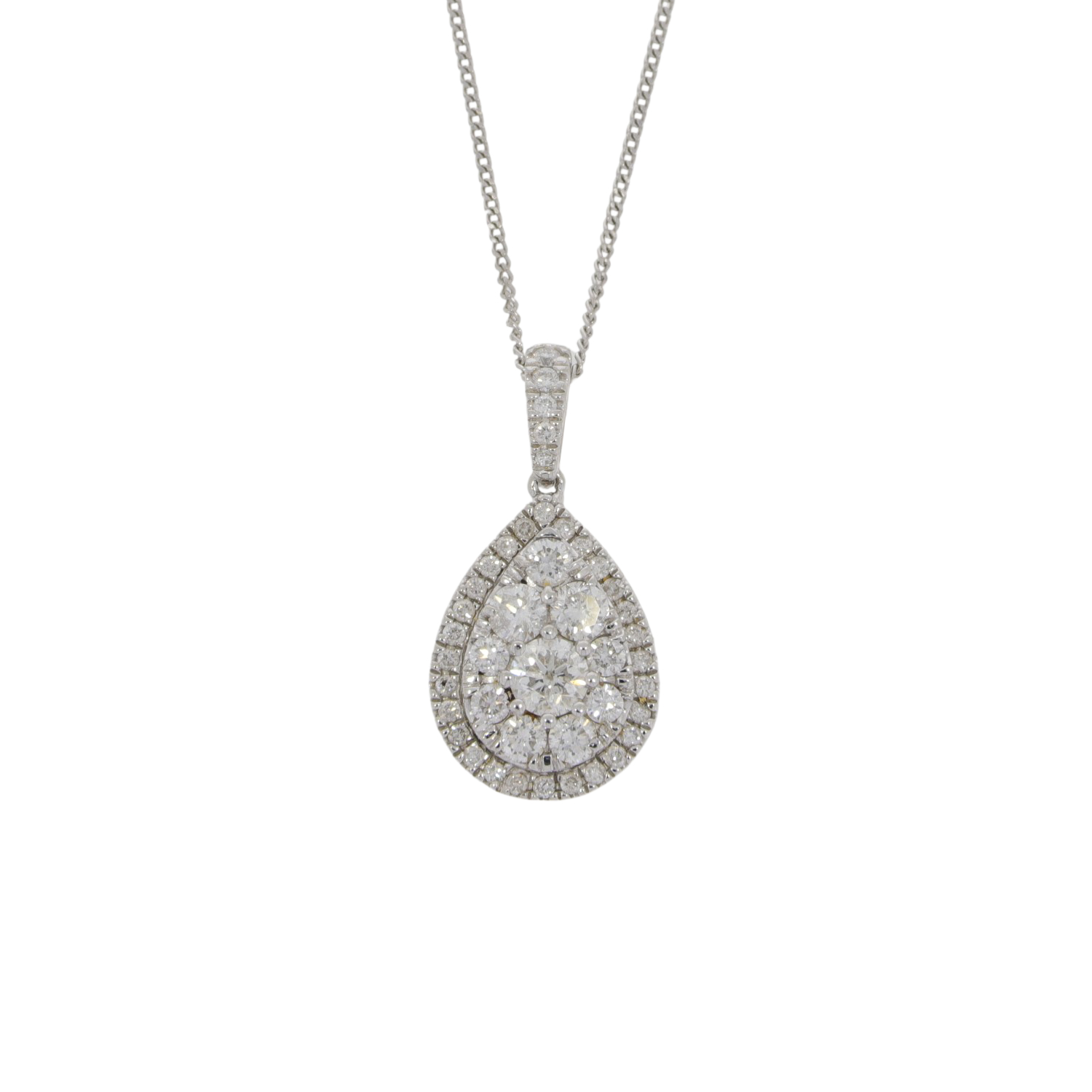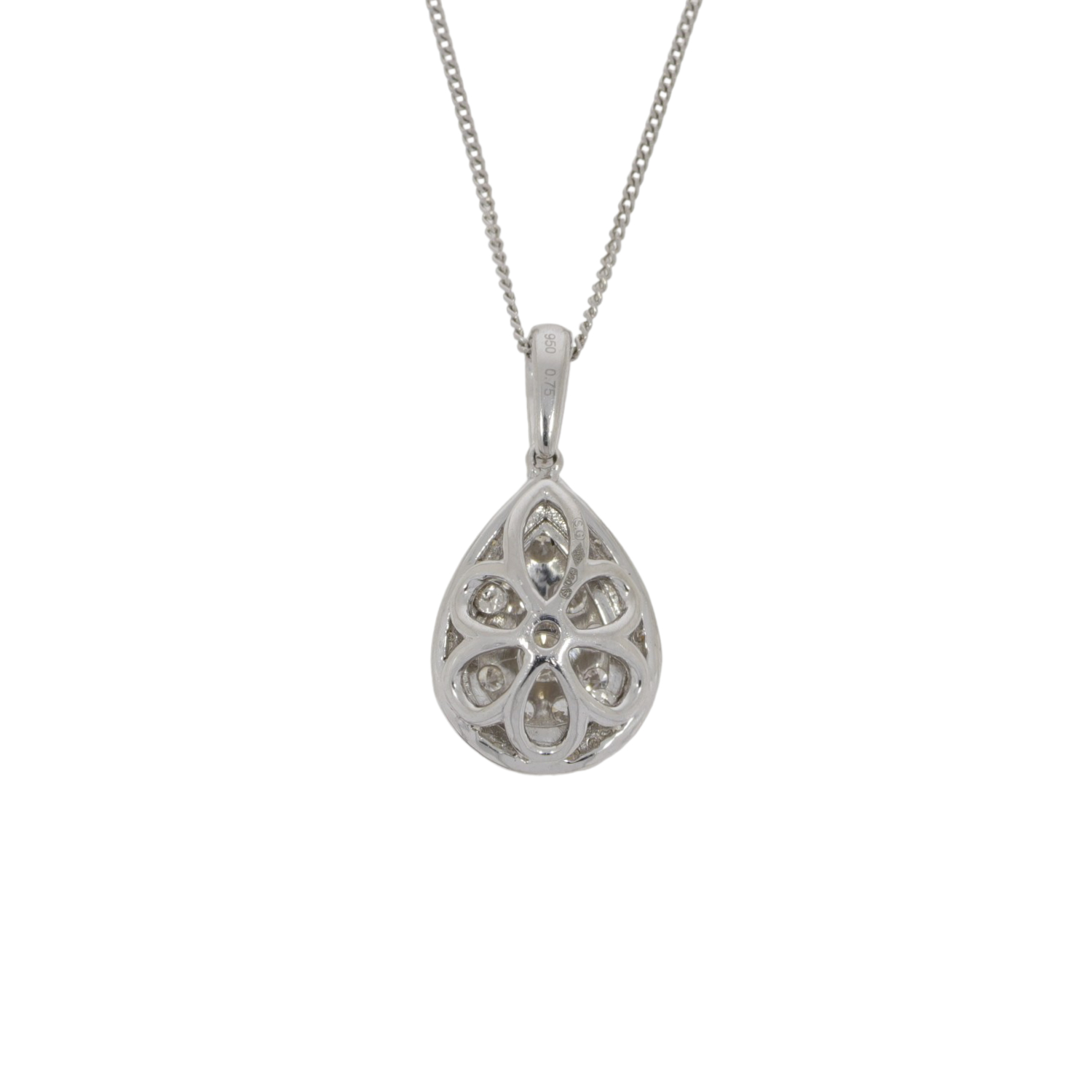 A pear shaped diamond cluster drop pendant with halo surround and diamond set loop. The central cluster is made up of 10 modern brilliant cut diamonds of differing sizes to reach the pear shaped cluster. This is surrounded by a halo of equal sized modern brilliants and suspended from a tapering diamond set loop of 5 diamonds. All mounted in a platinum setting, with a detailed back to the reverse. The pendant loop is free to move and the fine necklace chain is also made from platinum and can be adjusted in length by sliding along, meaning it can be longest at 18 inches.