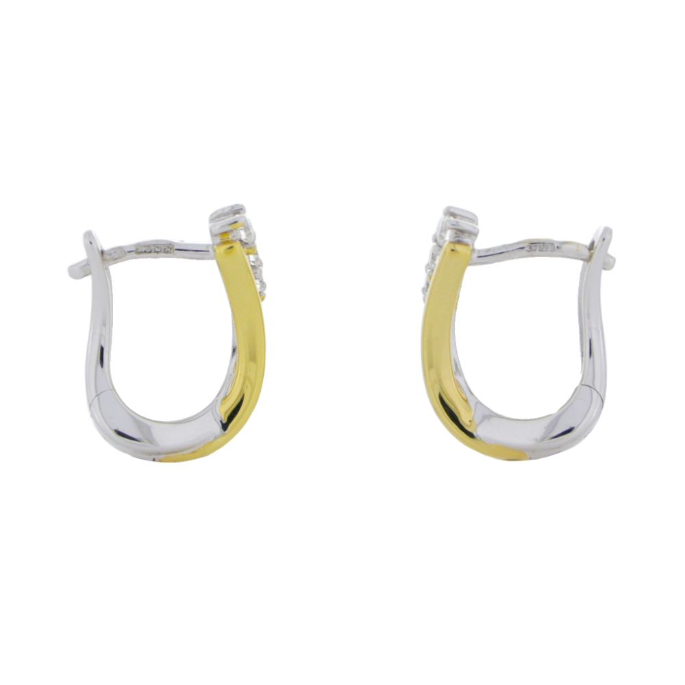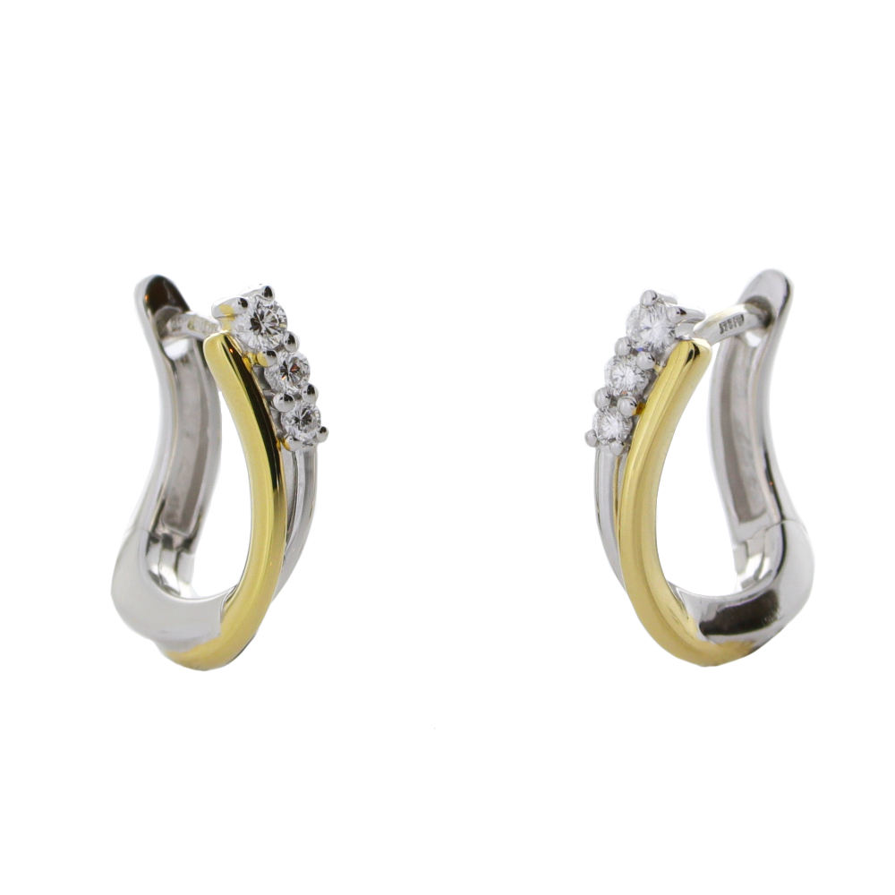 Graduated triple brilliant cut diamond set hoop earrings, with 9ct white and yellow gold two row curving split hoop earrings. Highly polished gold.