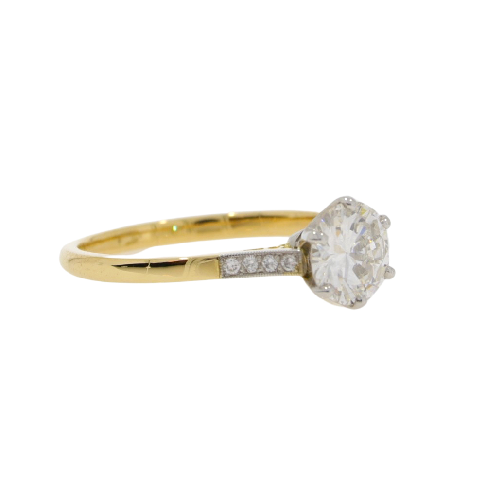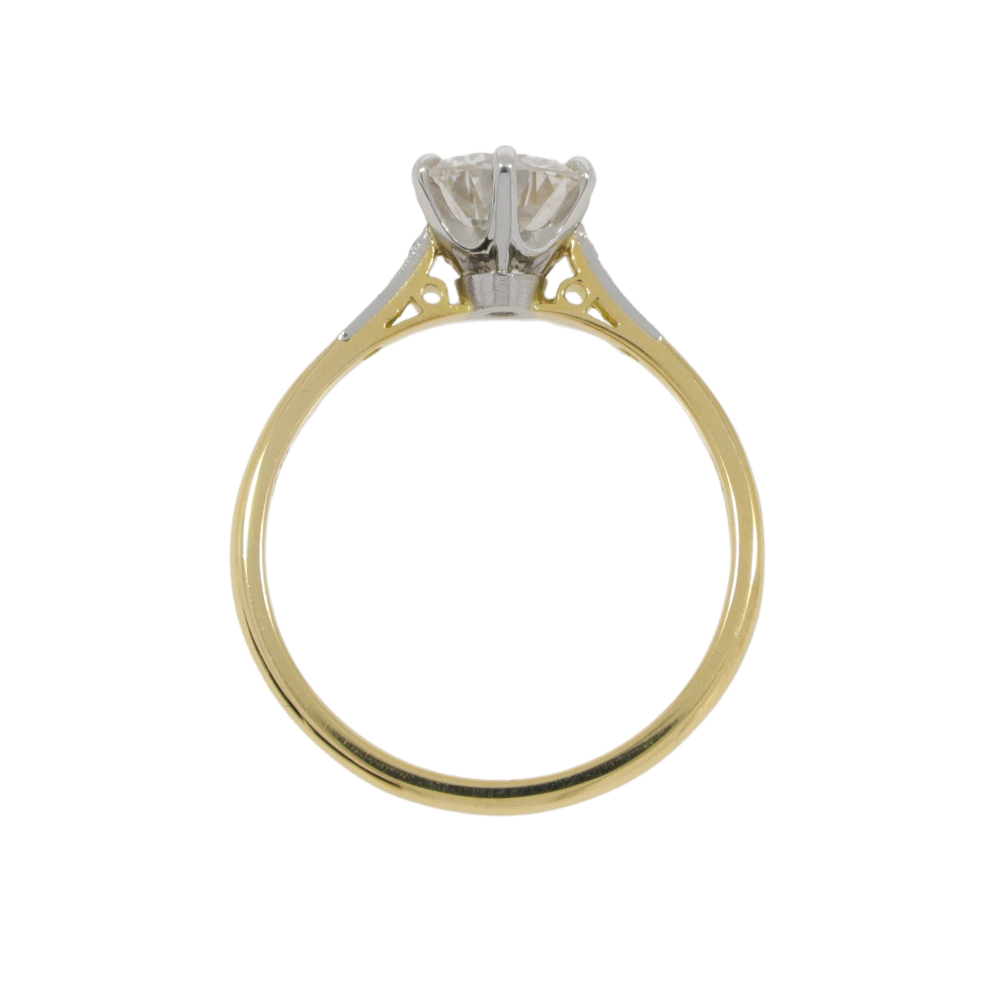 The principal diamond has come from a tired piece of jewellery, and has been given a new lease of life in this brand new mount. The neat platinum 6 claw setting rising up from the yellow gold band holds it firmly in place. The shoulders are faced with platinum and neatly set with 4 brilliant cut diamonds on each side. The shank in bright lustrous yellow gold, makes this ring a classic.