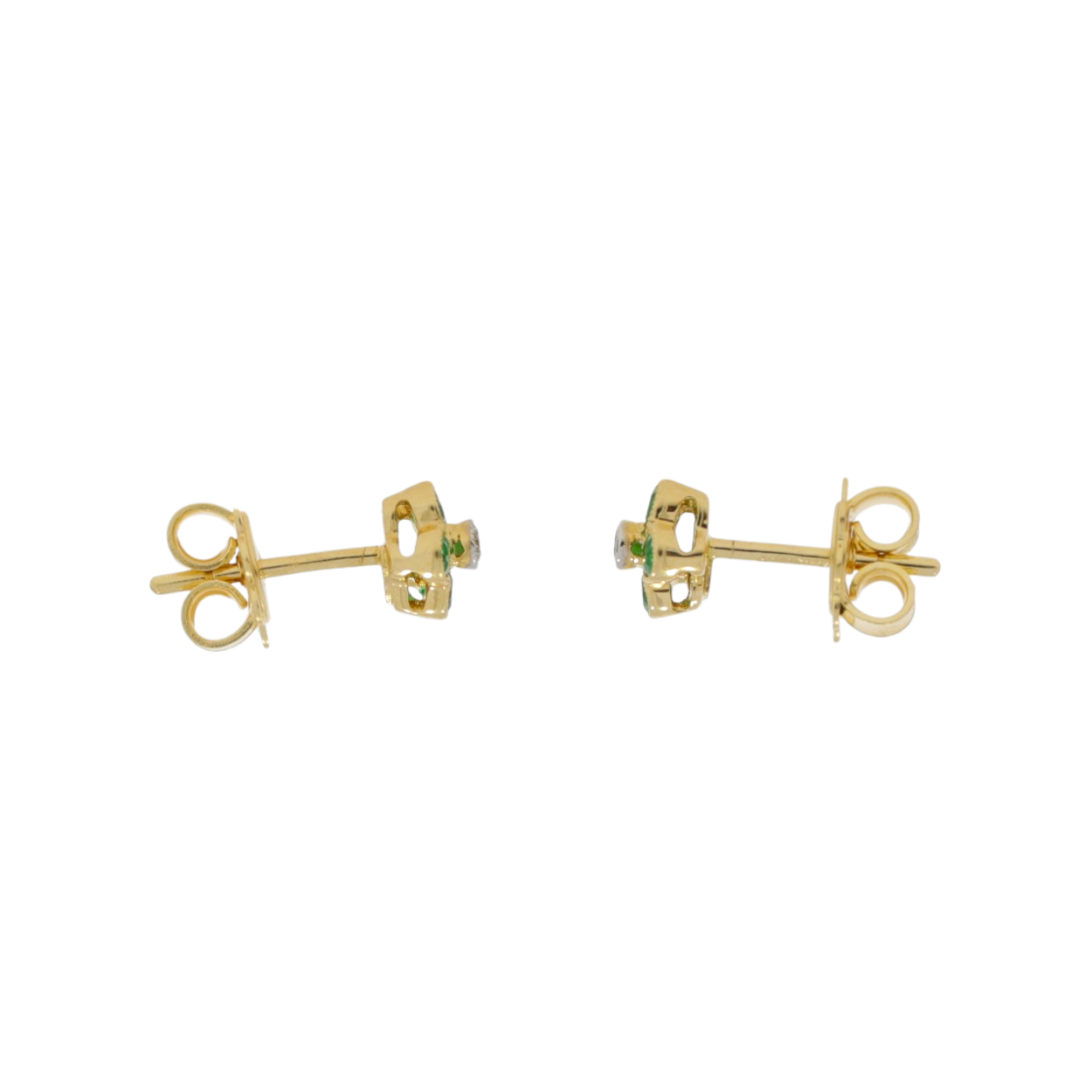 Emerald and diamond six stone inverted cluster stud earrings. With a brilliant cut diamond in the centre, slightly higher than the surrounding 5 round cut bright green emeralds. All held in a neat 18ct yellow gold millegrain settings and secured with traditional post and butterfly fittings.