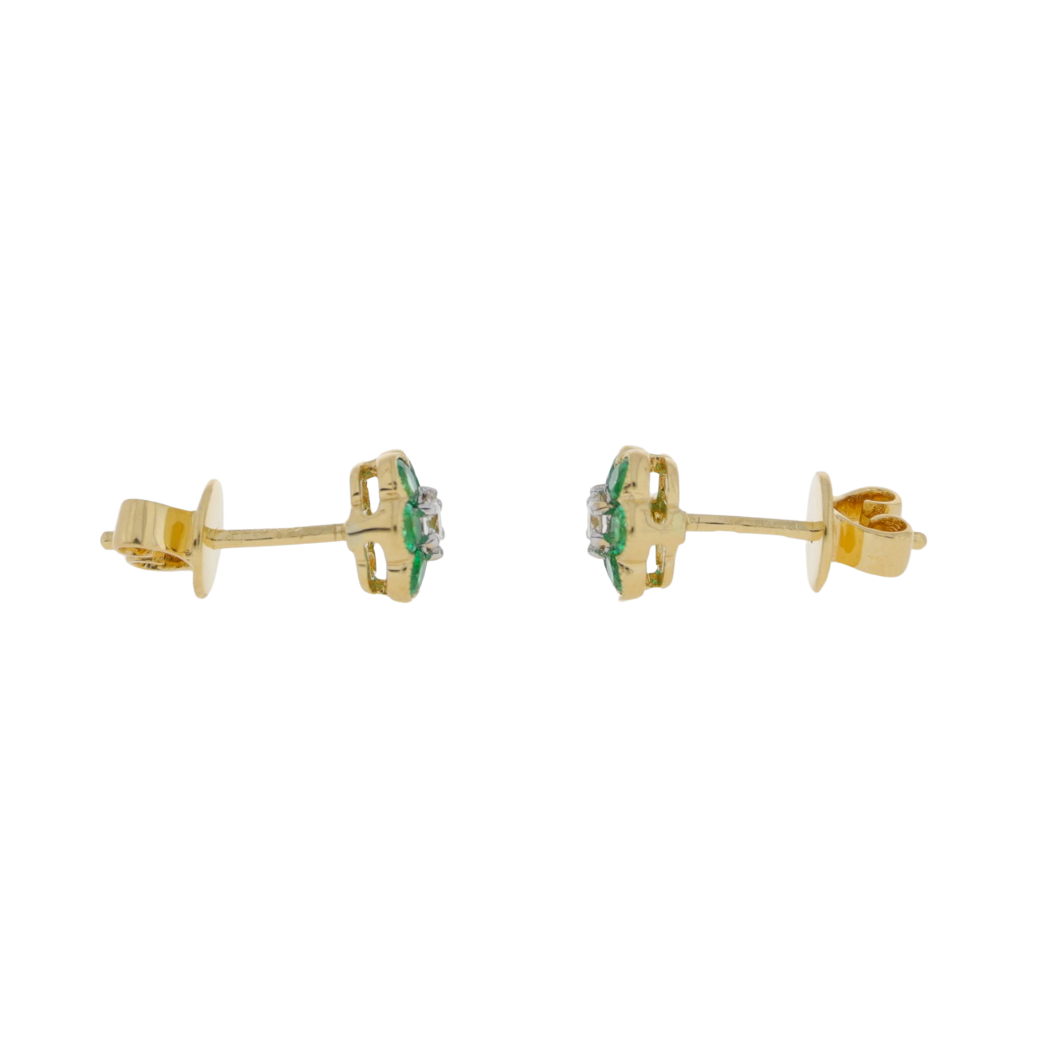 - Emerald and diamond 7 stone flower cluster earrings, 18ct yellow gold mounts