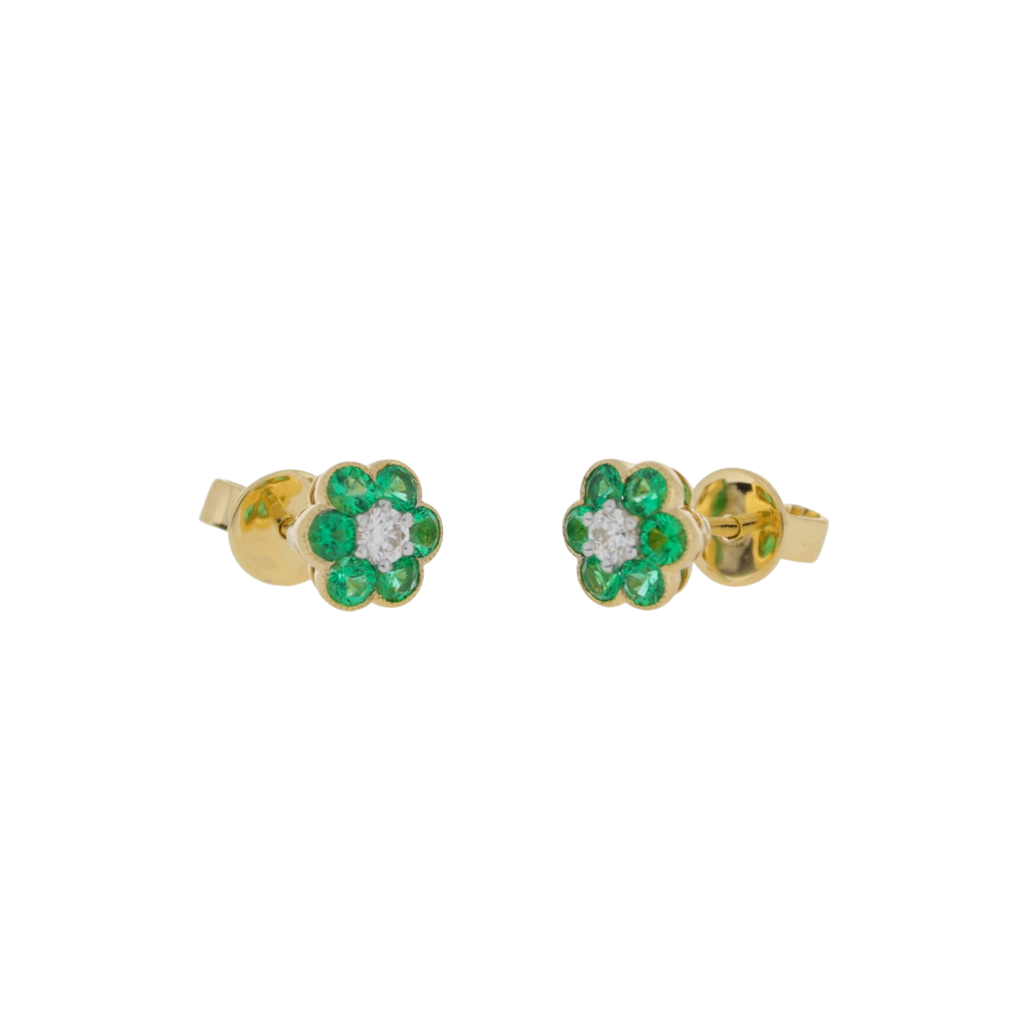Emerald and diamond seven stone inverted flower shaped cluster stud earrings. With a brilliant cut diamond in the centre, slightly higher than the surrounding 6 round cut bright green emeralds. All held in a neat 18ct yellow gold millegrain settings and secured with traditional post and butterfly fittings.