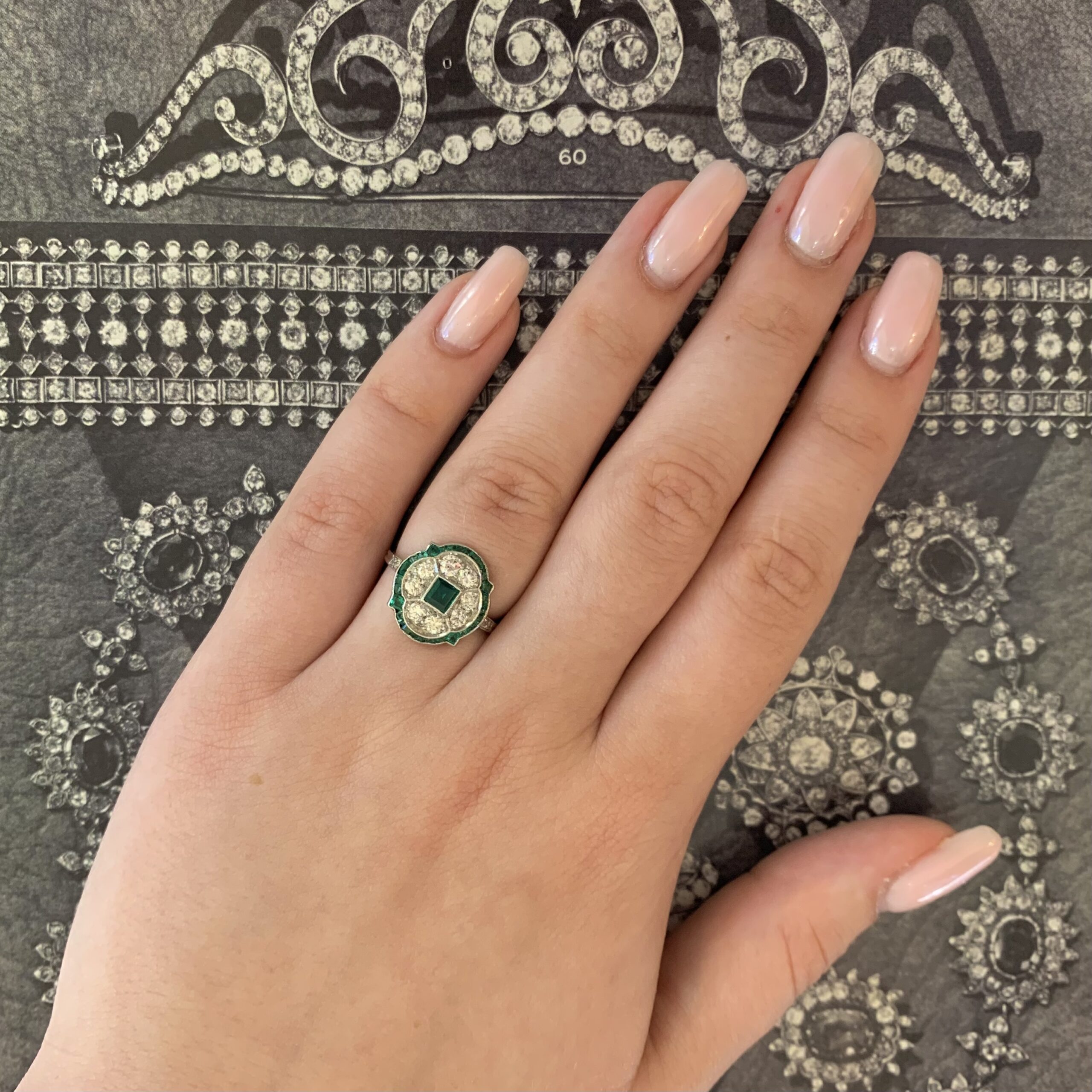 - Emerald and diamond Art Deco French cluster ring, platinum mount