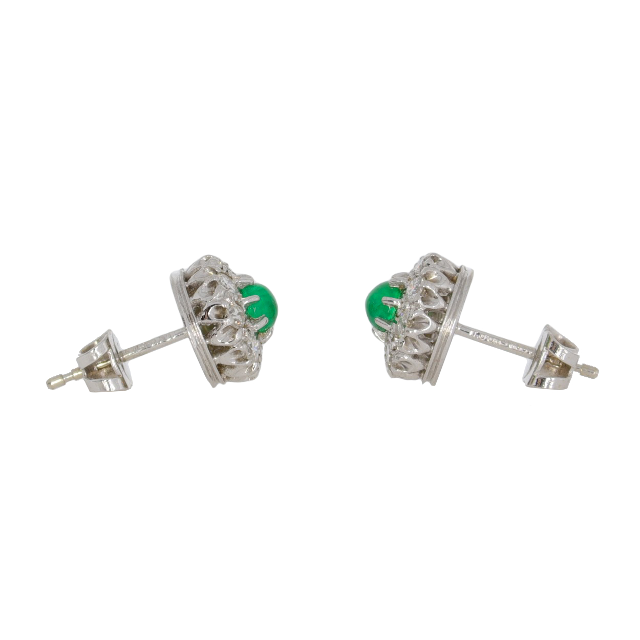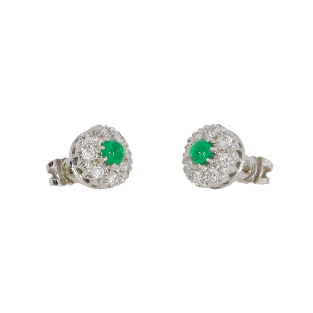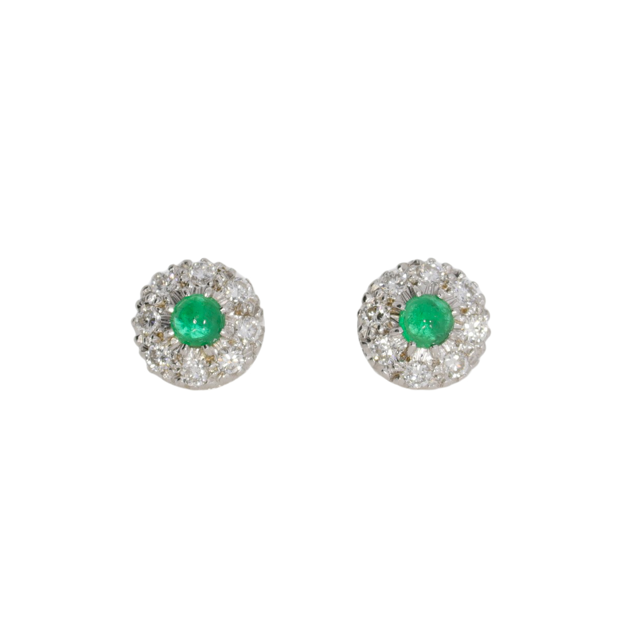 Circular pair of emerald and diamond nine stone cluster earrings, with central Cabochon cut emerald, claw set in 18ct white gold mounts, and surrounded by eight modern brilliant cut diamonds in claw settings and interspaced with diamond cut white gold mounting.