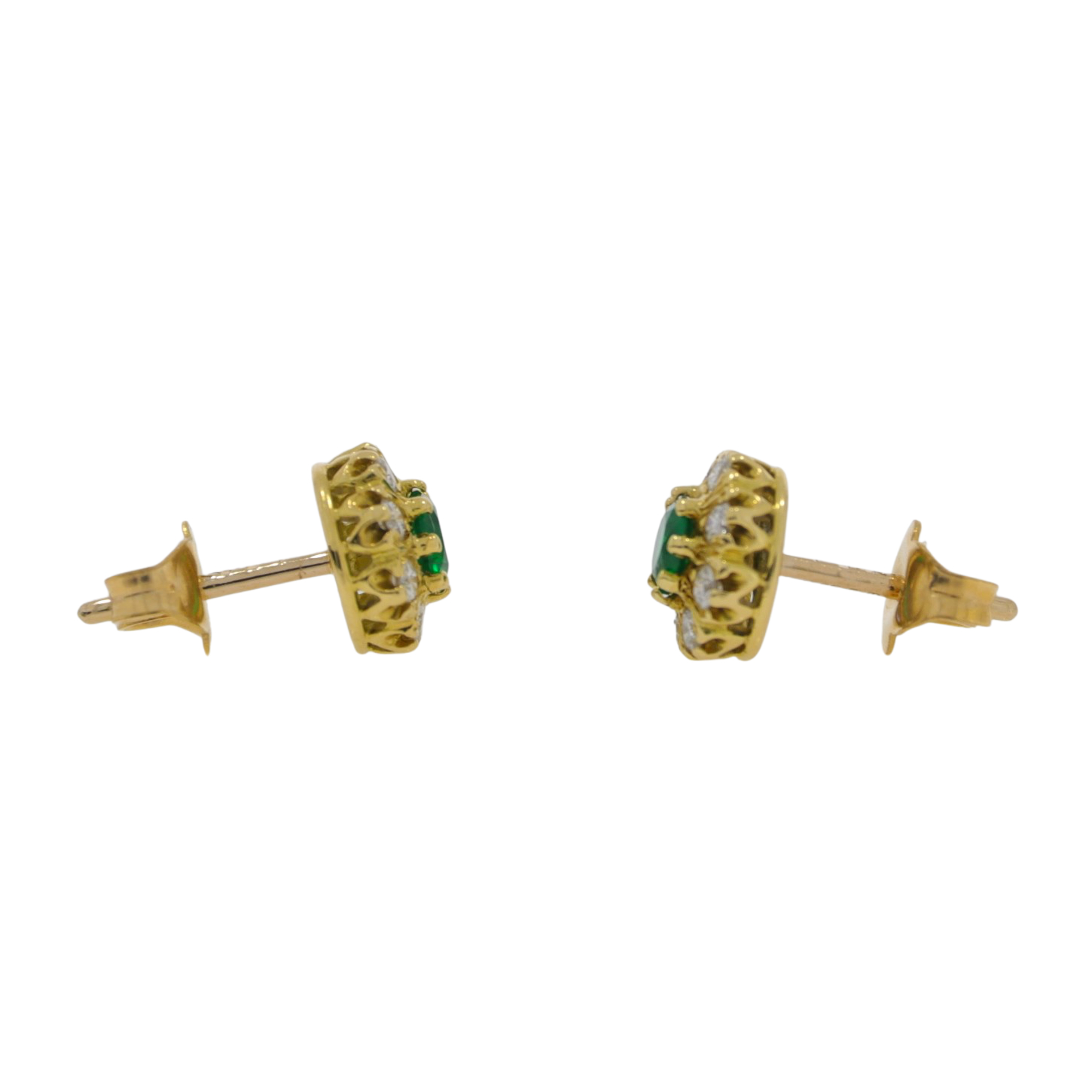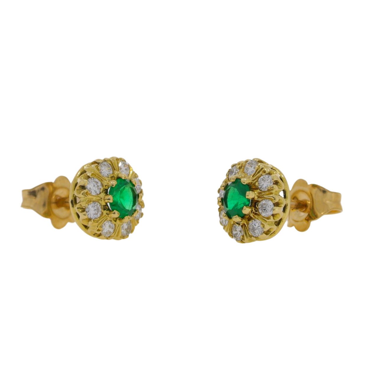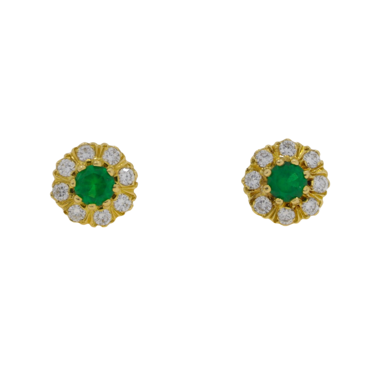 A timeless pair of emerald and diamond nine stone circular cluster earrings, with 8 modern brilliant cut diamonds all claw set, with V shaped division in 18ct yellow gold, with a larger central circular mixed cut Emerald set in 18ct yellow gold claw settings, set slightly above the diamonds. Secured with traditional post and butterfly fittings.