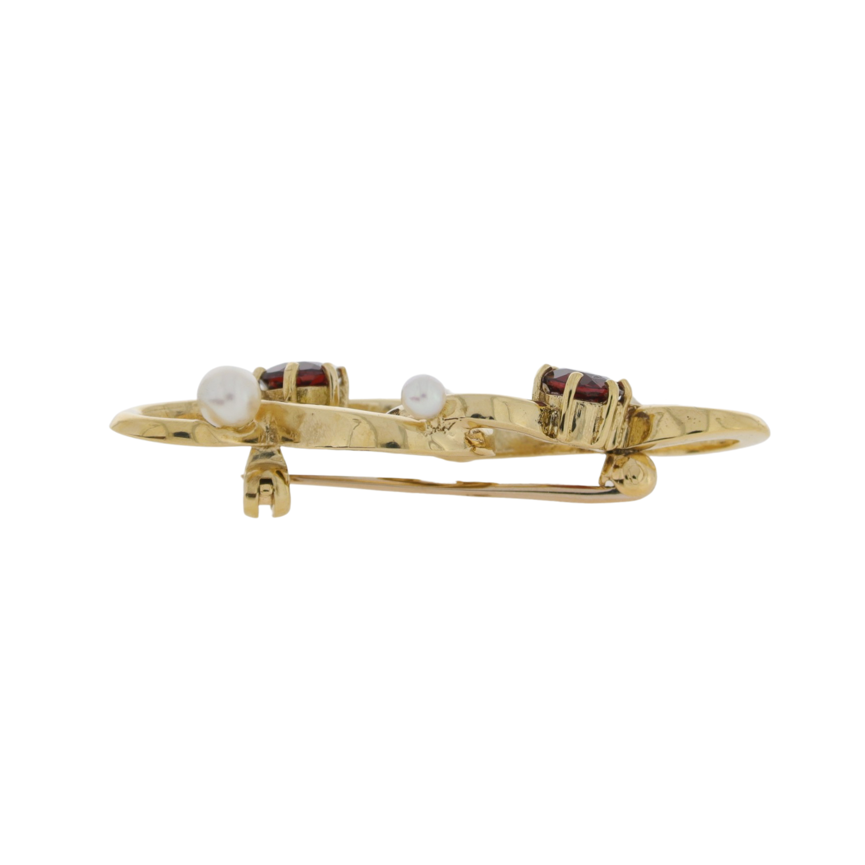 Two garnets and four cultured pearls are neatly mounted on entwined 9ct yellow gold figure of 8 scrolls. The round garnets are held securely with 6 yellow gold claws complimenting the warmth of the red tones of the garnets. At 12 & 6 are two slightly smaller cultured pearls and two larger cultured pearls are paired next to the garnets. On the reverse the pin closes securely into a roll over safety catch.