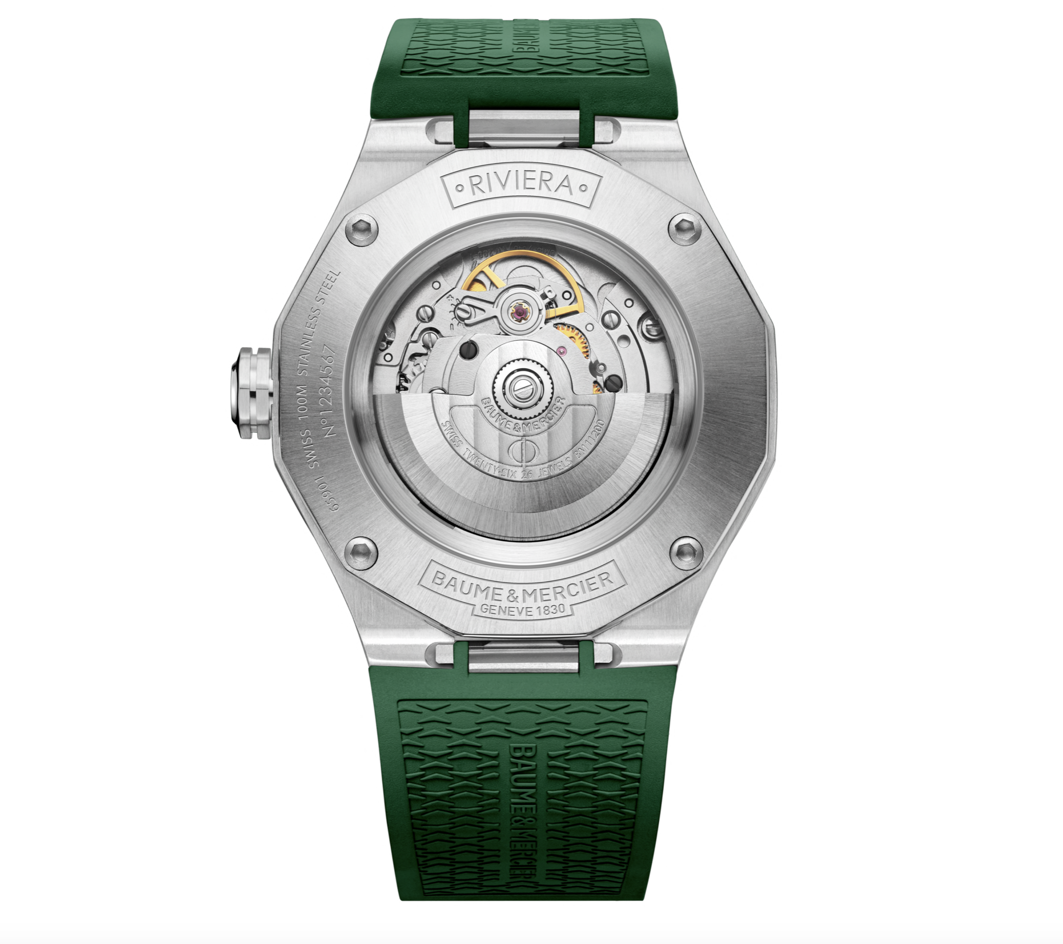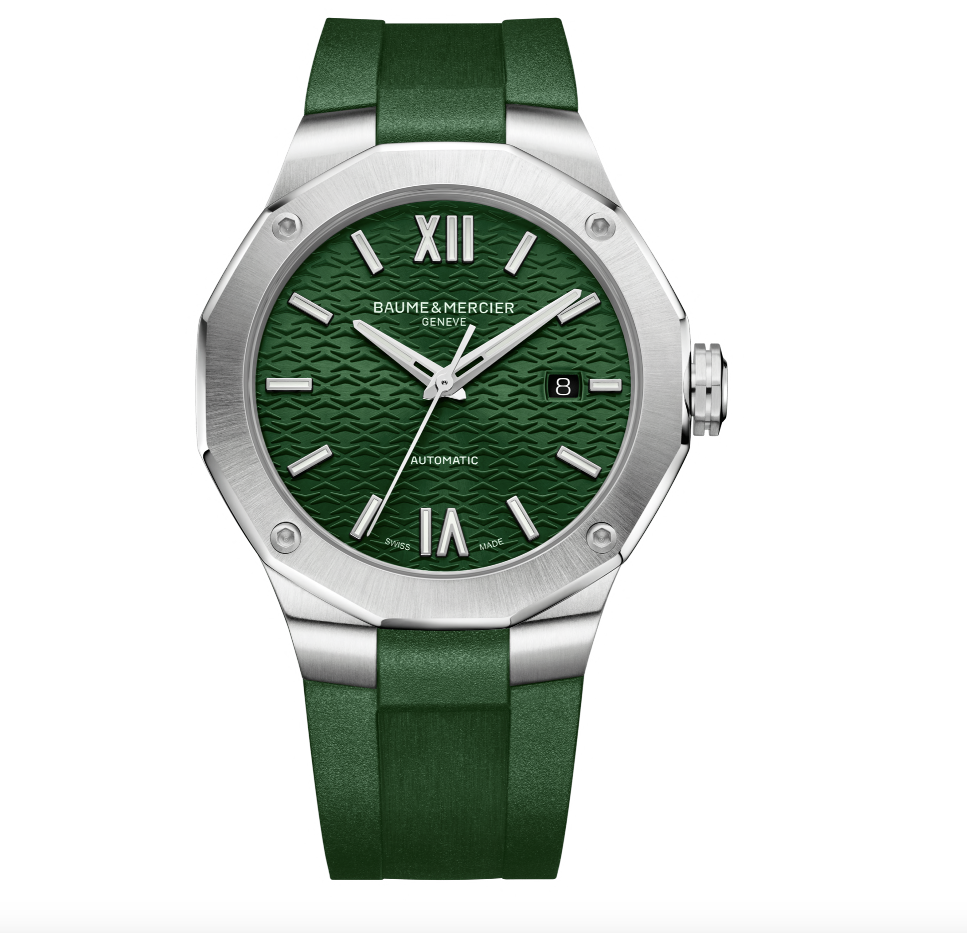 Gents stainless steel Baume & Mercier Riviera automatic date watch on green rubber strap. Sporty, dressy and casual Swiss made automatic calibre