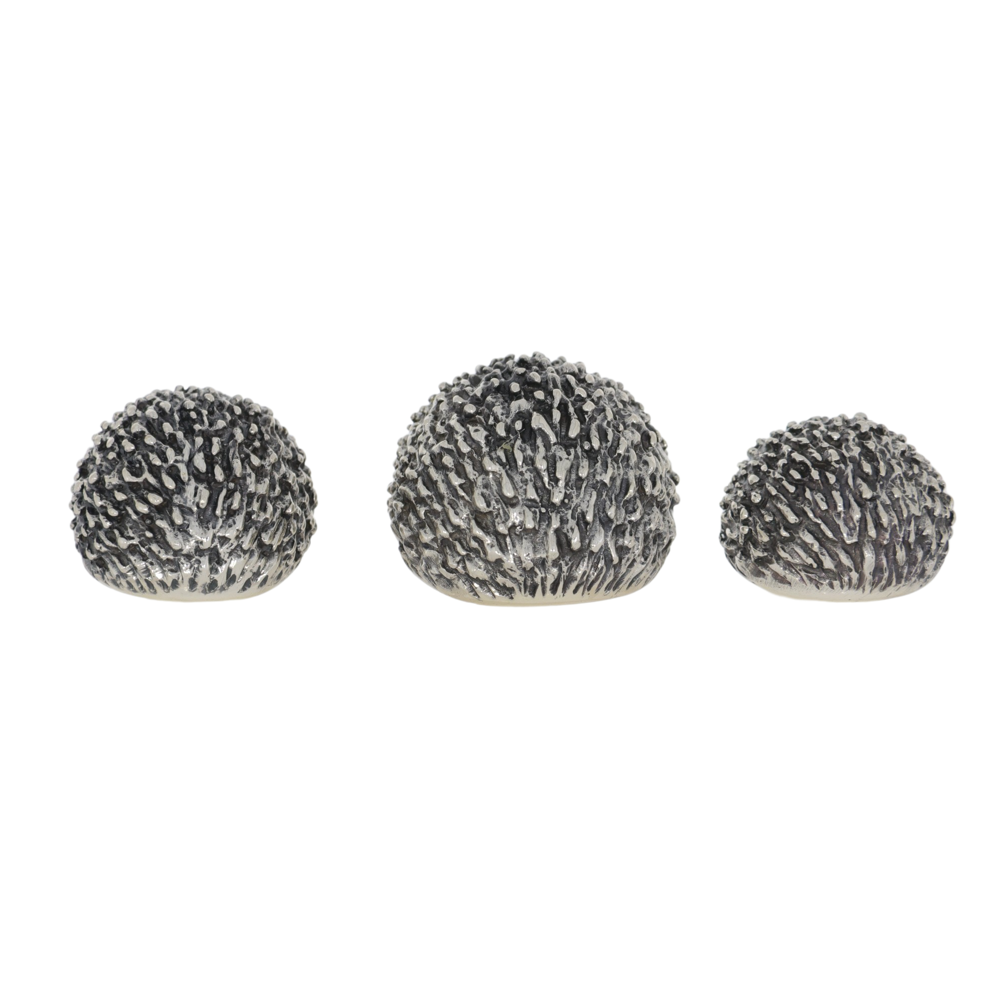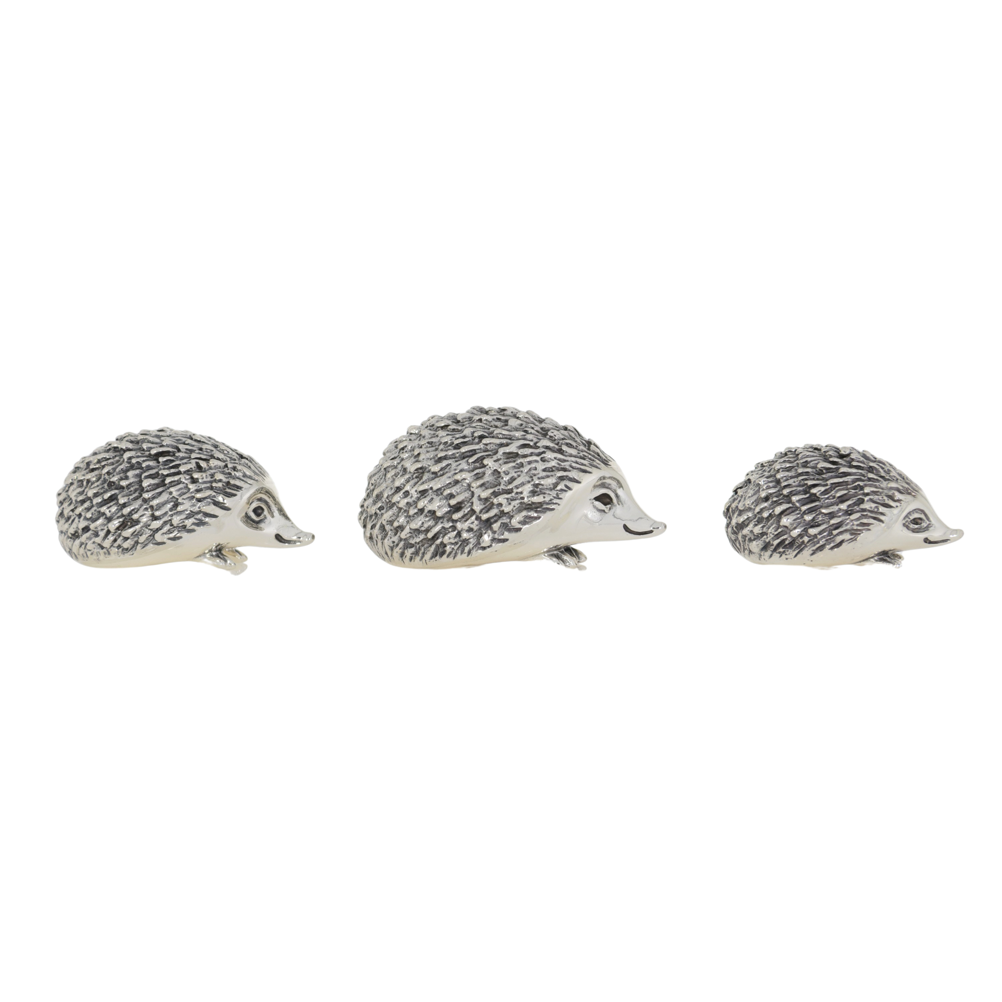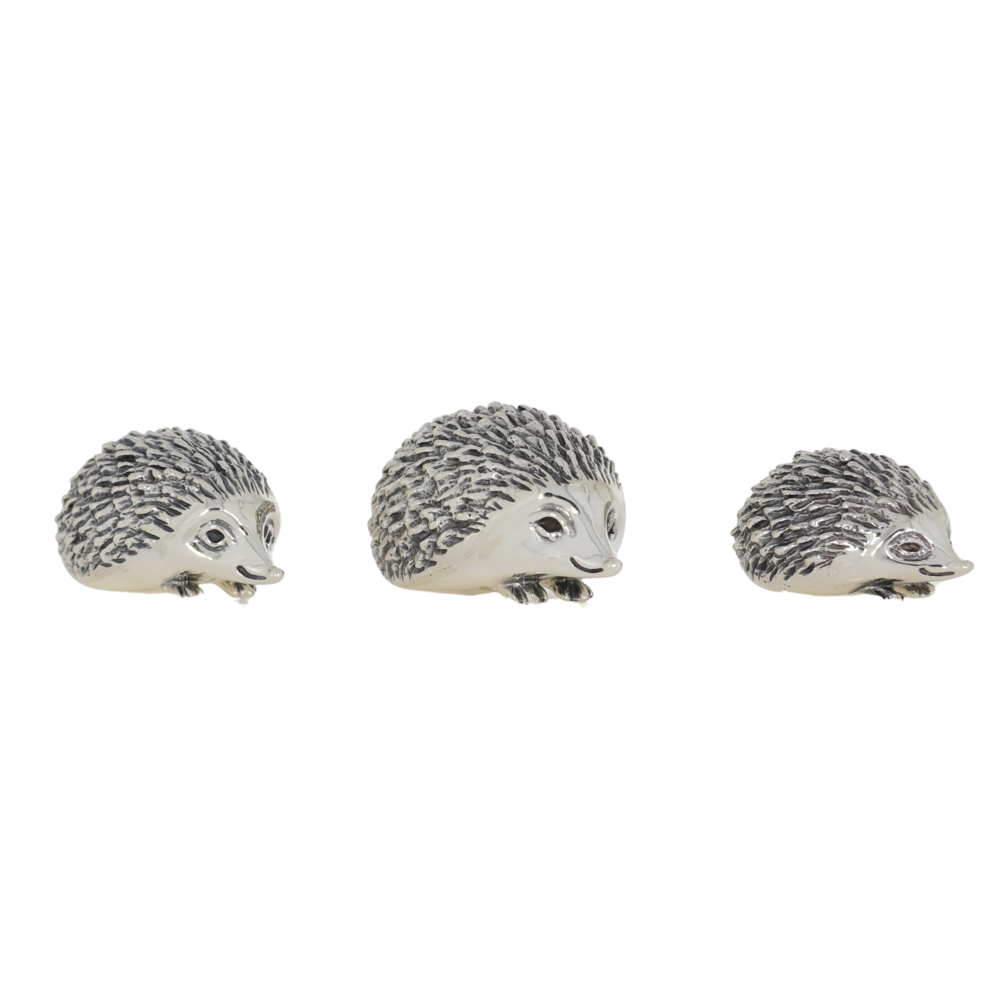 Sterling silver family of three Hedgehog ornaments by Saturno. With part oxidised textured finish across the backs of the hedgehogs and cute smiles.