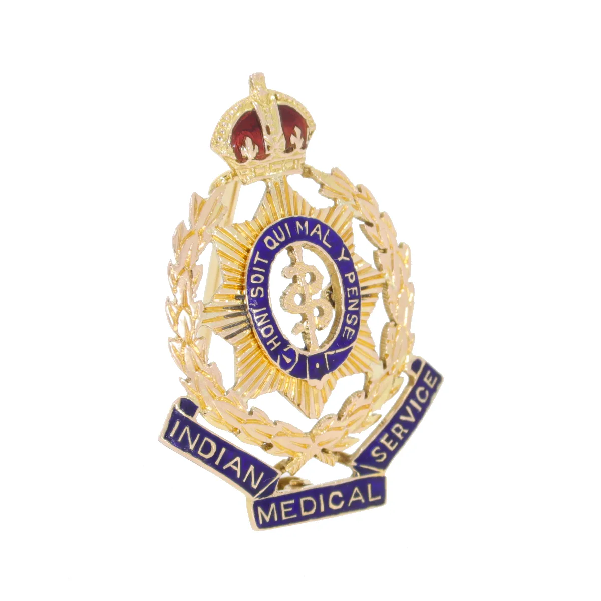 Indian Medical Service sweetheart brooch with a gold laurel wreath surrounding the latin Moto – “HONI SOIT QUI MAL Y PENSE” all enamelled in blue with gold serpent and staff in the centre. To the bottom “INDIAN MEDICAL SERVICE” in a blue enamelled ribbon and at the top a King’s crown in gold and red enamel. All made in 9ct yellow gold.