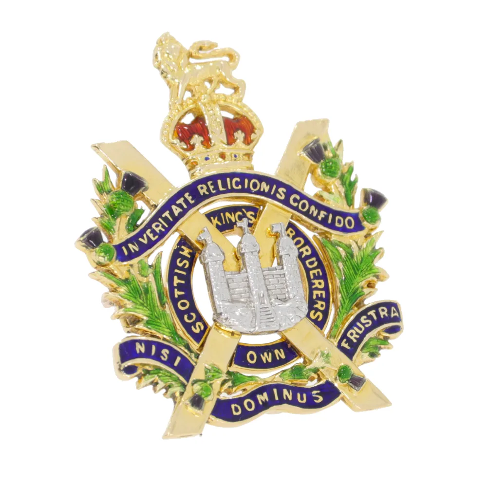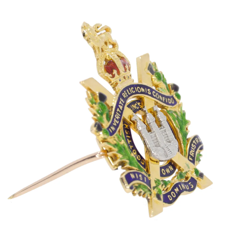 King’s Own Scottish Borderers Regimental sweetheart brooch exquisitely made 18ct gold and enamel. In the centre of the yellow gold cross of St Andrew in white gold is Edinburgh Castle with three turrets and each with a flag flying to the left. The castle is surrounded in a blue enamel circlet at the back of the brooch “KING”S OWN SCOTTISH BORDERERS”. Above and below the circlet within blue enamel scrolls “IN VERITATE RELIGIONIS CONFIDO NISI DOMINUS FRUSTRA” A wreath of green enamel thistles with purple flowers surrounds the circlet and the Royal Crest with red enamelled St Edwards Crown surmounts the brooch.