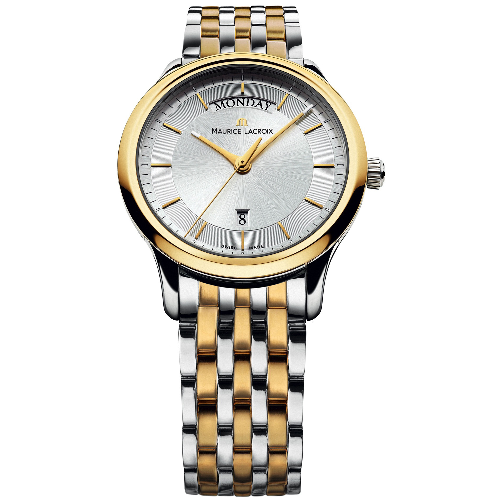 Gents stainless steel and yellow PVD Maurice Lacroix Les Classiques quartz watch with day window in full at 12, date window at 6 and a centre second indication. Silvered dial with polished yellow hands and batons. On a two colour stainless steel and yellow PVD polished and satinised seven row bracelet with quick release fastener.