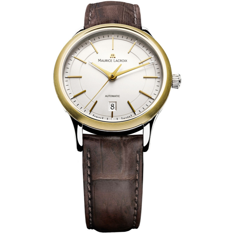 Gents stainless steel and 18ct yellow gold Maurice Lacroix Les Classiques automatic watch with date window at 6 and a centre second indication. Steel case with brushed 18ct yellow gold bezel. Silvered dial with polished gilt hands and batons. On a brown leather strap with stainless steel pin buckle