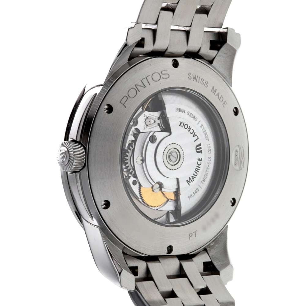 Gents stainless steel Maurice Lacroix Pontos automatic watch with full day window at 12, date window at 6 and a centre second indication. Silvered dial with radiant polished silver hands and batons. On a polished and satirised stainless steel five row bracelet with triple folding clasp.