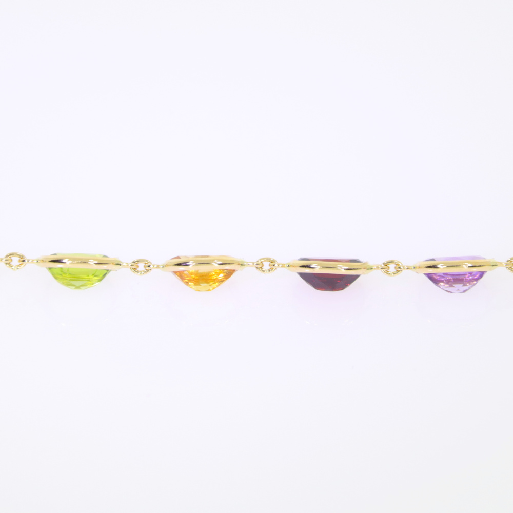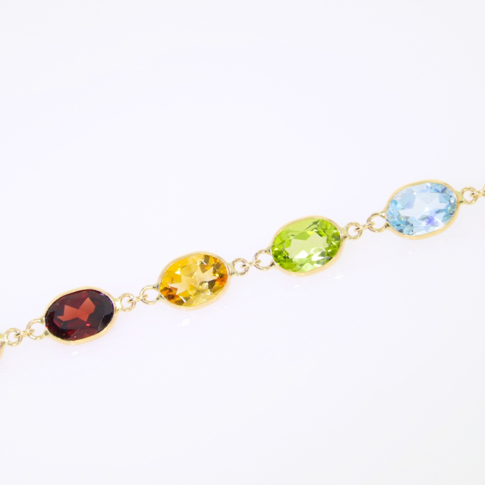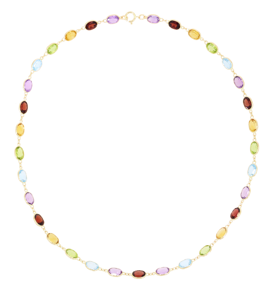 A beautiful multi gemstone necklace comprising of Amethyst, Garnet, Citrine, Peridot, and Blue Topaz in a continuous repeat around the neck. Each gemstone is an incredibly bright oval cut stone held in an 18ct hallmarked Yellow gold smooth rub over gold mount with neat links in between, these beautiful pieces go with various different colours of outfit making them very wearable pieces.