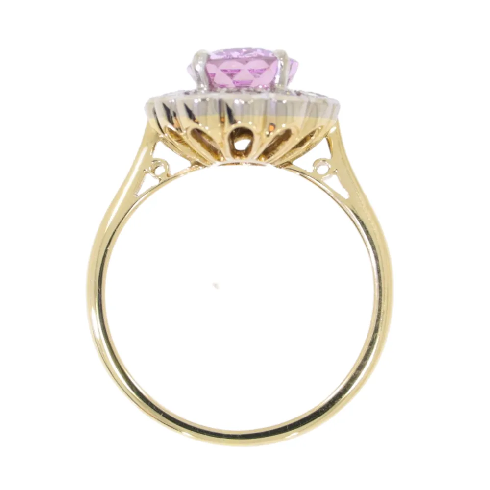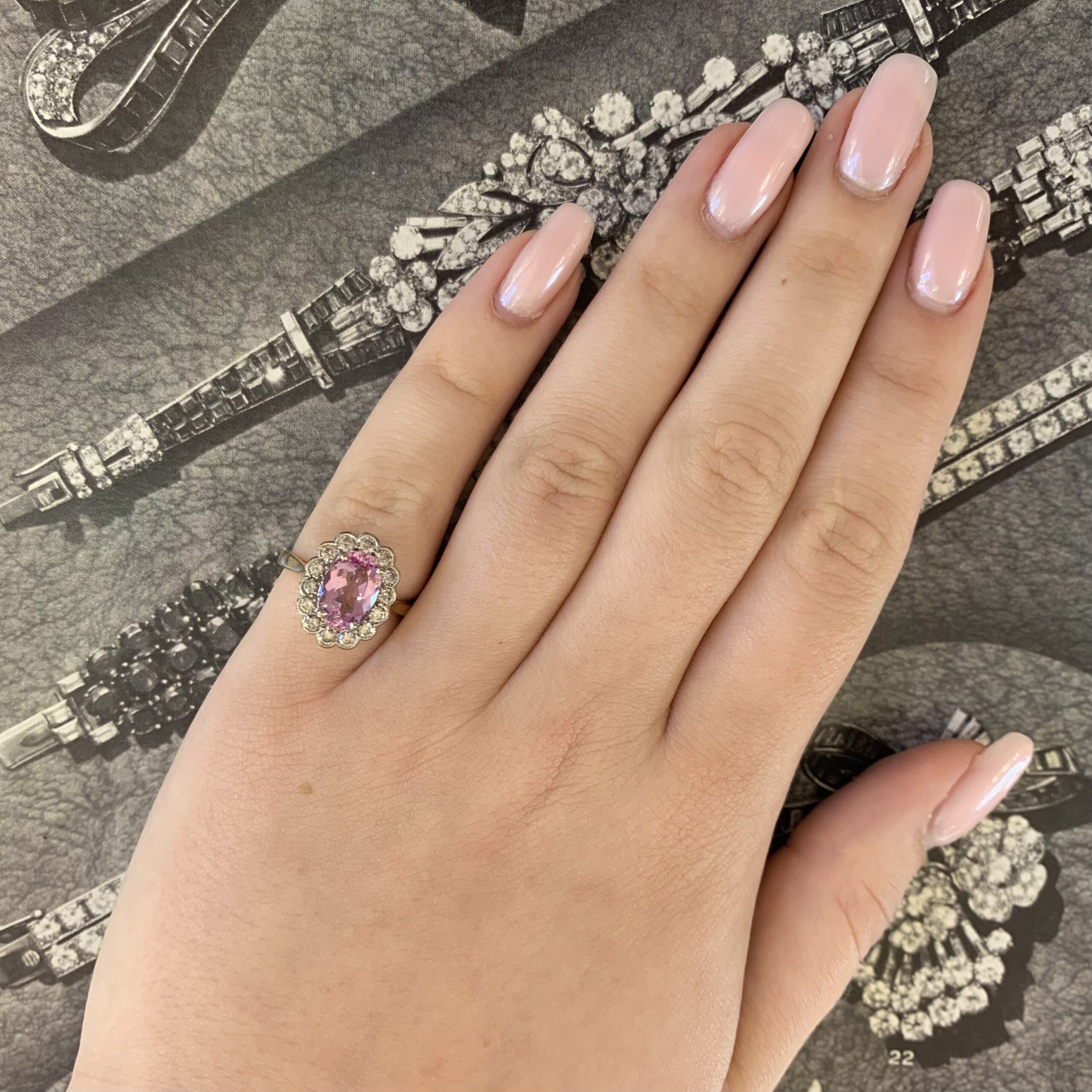Pink topaz and diamond traditional cluster ring. The large central oval cut Pink Topaz is held in a four claw white gold setting, surrounded by 14 modern brilliant cut diamonds in a smooth millegrain white gold setting. With an 18ct yellow gold shank. The underneath is just as nice on the underneath wit lovely webbed mounting.