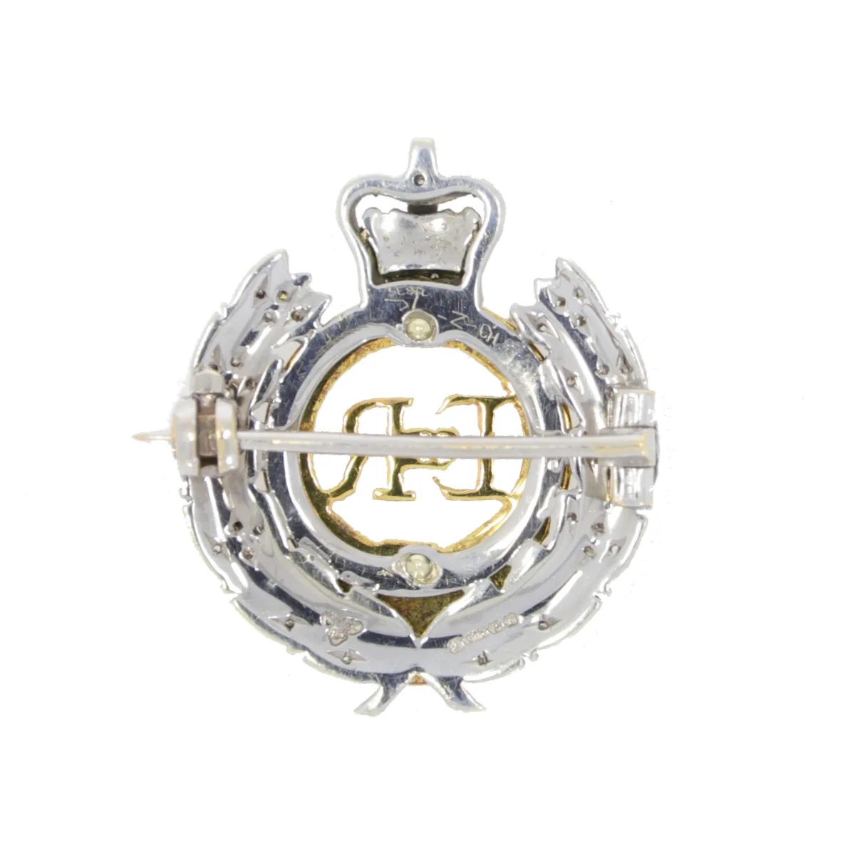 A superb example of one quality Regimental brooch. The Royal Engineers sweetheart brooch with a diamond set laurel wreath surrounding the latin Moto – “Honi Soit Qui Mal Y Pense” all enamelled in blue with Queen Elizabeth II insignia in the centre. Embellished with a white gold crown and red enamel. All made in 9ct white gold and with 9ct yellow gold used around the enamelled parts.