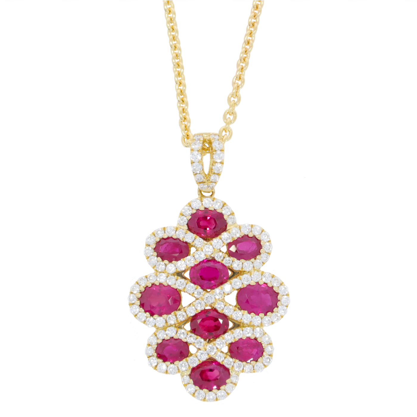 Ruby and diamond fancy pendant, 18ct yellow gold mount and necklet