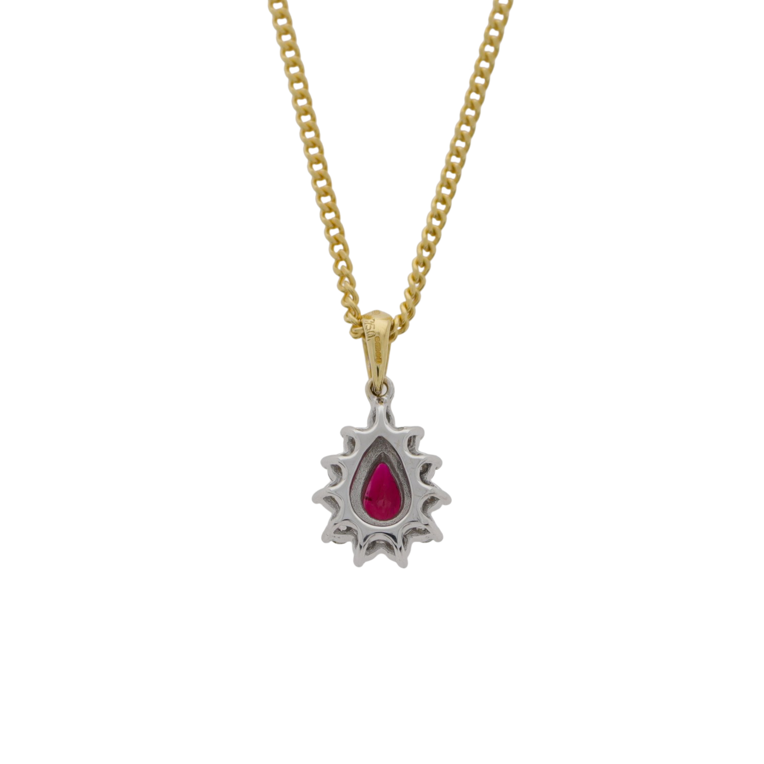 Pendeloque central ruby held with 18ct white gold four claw setting, and surrounded by 11 modern brilliant cut diamonds retaining the pear shaped cluster, each diamond with a neat white gold claw setting. The cluster is freely suspended from a tapered 18ct yellow gold loop and supplied with a matching 18ct yellow gold flattened curb link necklace (16 inches long) that glides easily.