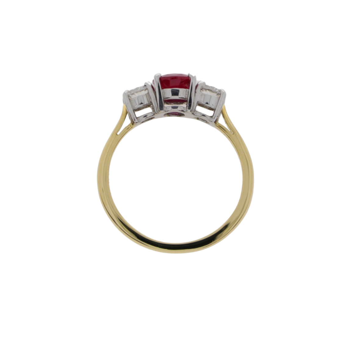 The ruby and diamond three stone ring is a classical ring and ideal for a Ruby wedding anniversary. The central oval cut ruby weighs 1.01cts and is held in with four 18ct white gold claws, and flanked on either side by a modern brilliant cut diamond each approx 0.20ct and held in with another set of four 18ct white gold claws. All mounted on a lustrous 18ct yellow gold shank.