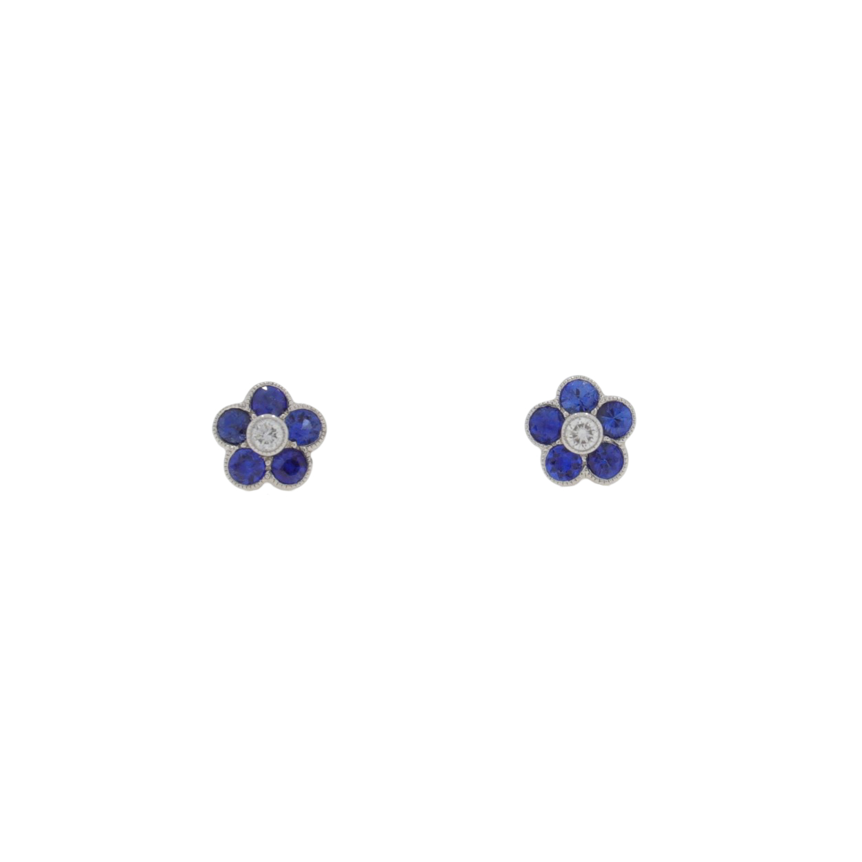 Sapphire and diamond six stone inverted cluster stud earrings. With a brilliant cut diamond in the centre, slightly higher than the surrounding 5 round cut bright blue sapphires. All held in a neat 18ct white gold millegrain settings and secured with traditional post and butterfly fittings.