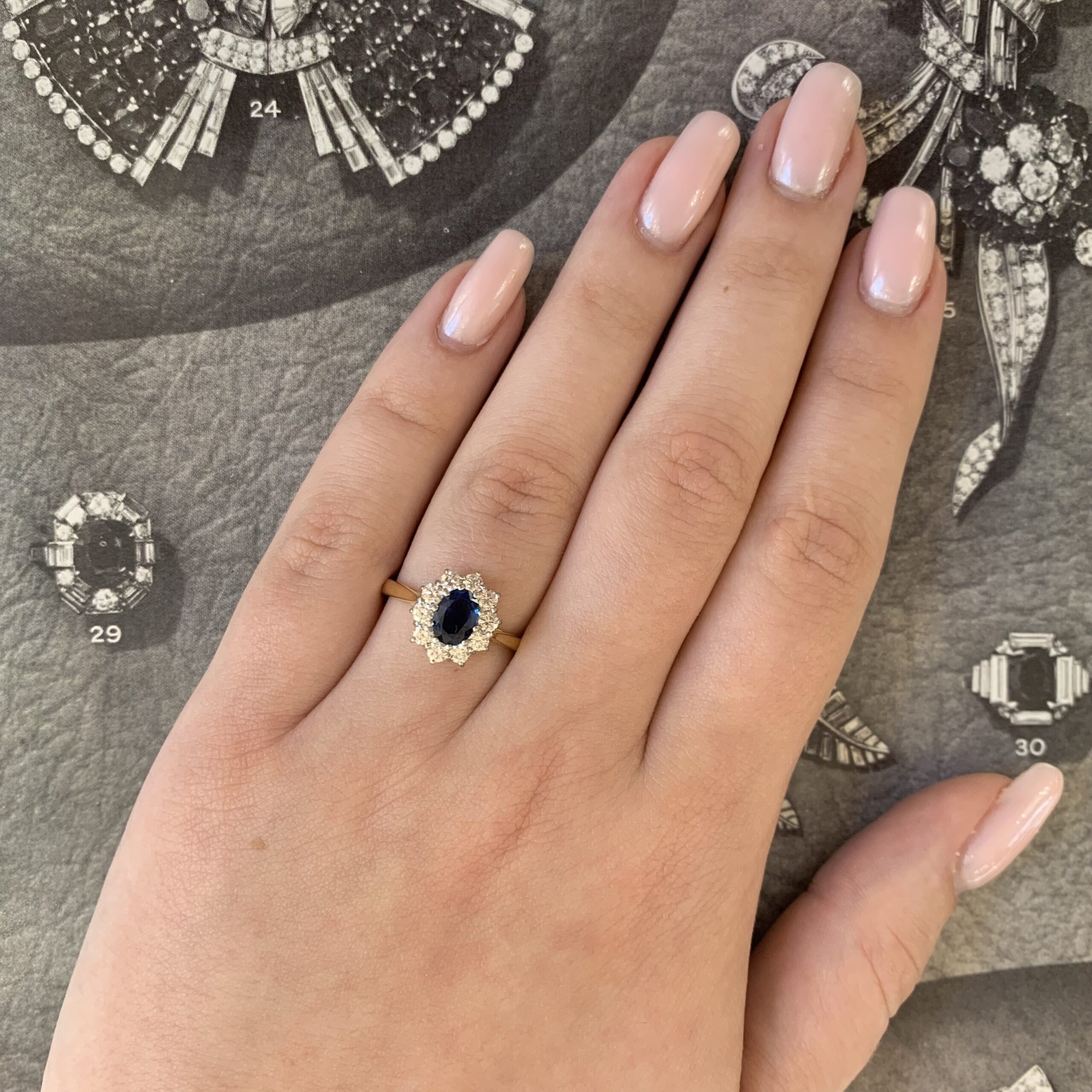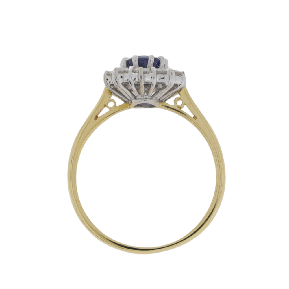This classical sapphire and diamond oval cluster ring has a central oval cut sapphire in a beautiful blue, set in a very neat 18ct white gold claw setting, surrounded by 10 modern brilliant cut diamonds also set in 18ct white gold neat claws. Mounted upon a classical 18ct yellow gold shank, this ring sits nice and low to the finger.