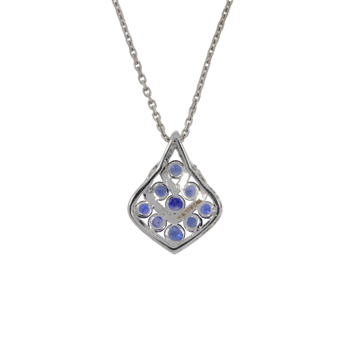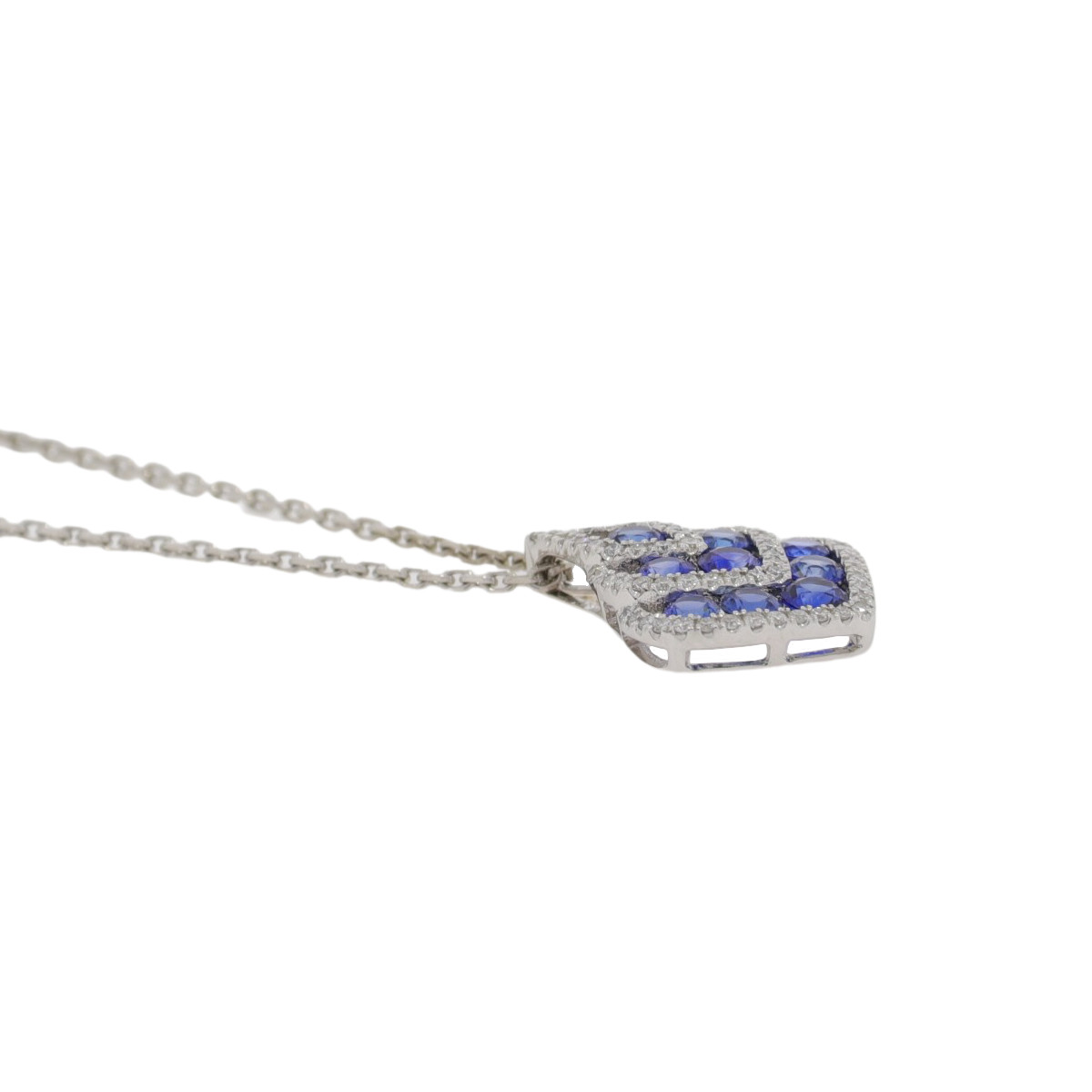 This beautiful sapphire and diamond pendant has nine circular cut sapphires in a bright vibrant blue. These are set in cascading rows graduating in width and each surrounded by a row of brilliant cut diamonds, mounted neatly in 18ct white gold mount and on a faceted trace 18ct white gold chain.