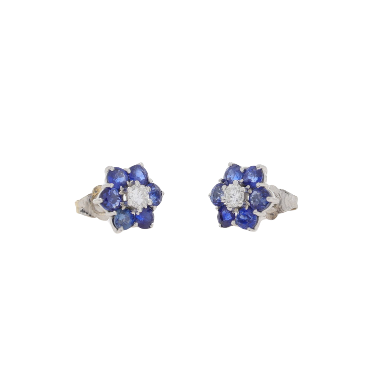 Vibrant sapphire and diamond seven stone inverted cluster earrings, with central brilliant cut diamond surrounded by 6 blue sapphires, all held neatly in 18ct white gold claw settings. Secured with traditional post and butterfly fittings.