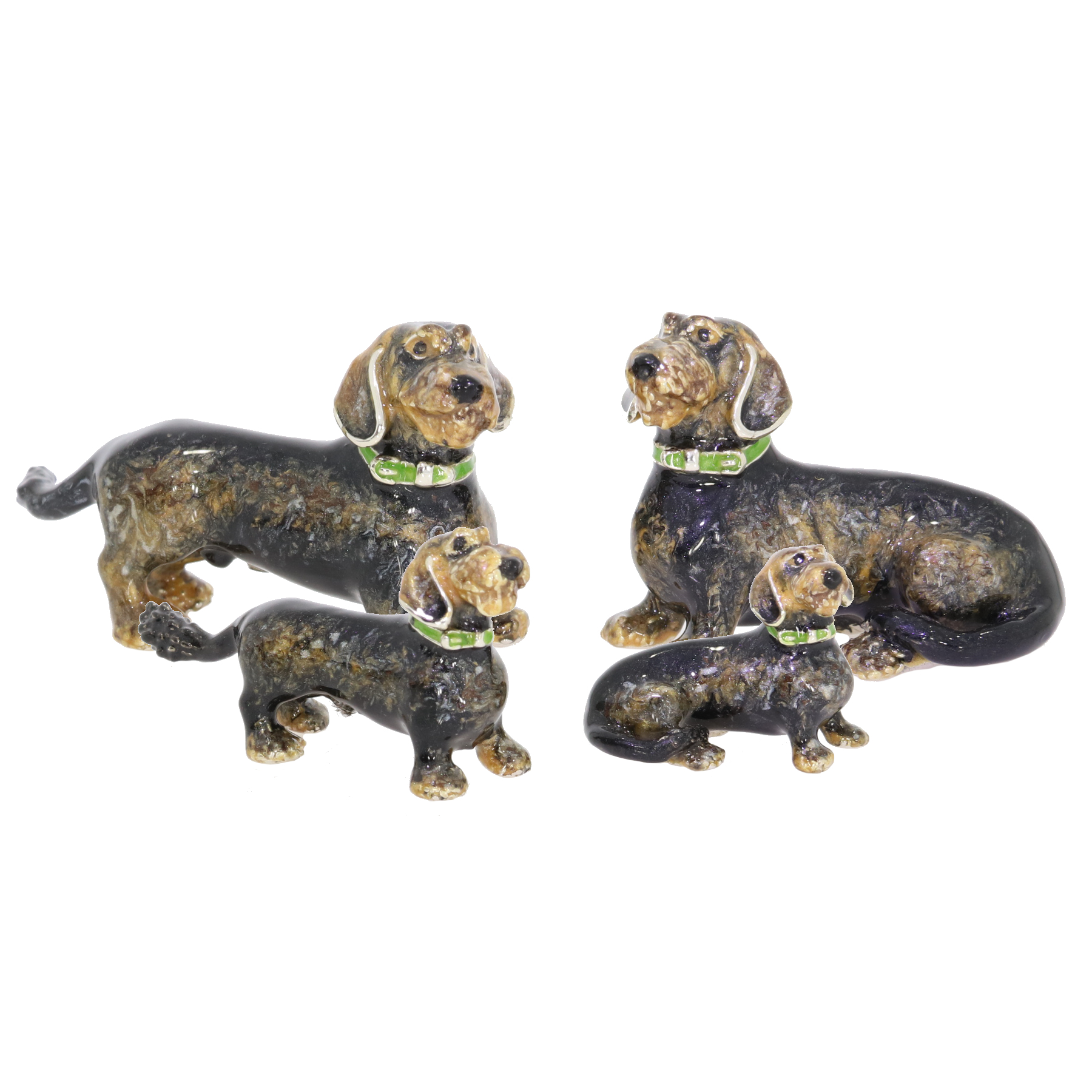 Sterling silver and enamel family of four long haired Dachshund ornaments by Saturno. With mottled brown enamelled bodies and a beautifully fully enamelled ornament. The tail, legs and head are also enamelled, the only visible silver is the padding of the feet, completed with green collars.