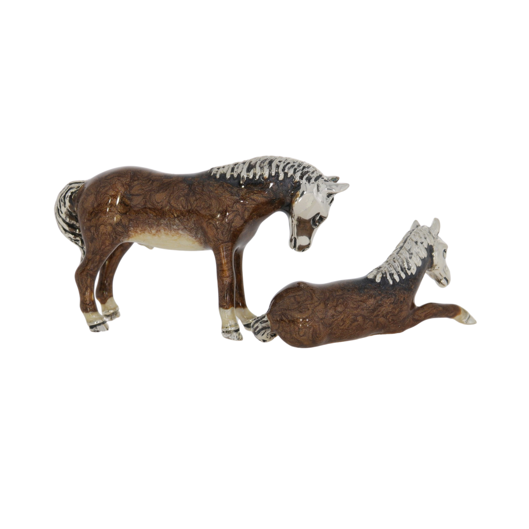 Sterling silver and enamel pair of horse ornaments by Saturno. With fully enamelled dark brown bodies and cream underbellies. The smaller is in a lying pose with its front leg outstretched and the tail curling round. The larger is standing with its head bent down towards the lying horse. Both pieces have textured mane and tail and a polished silver head and hooves. The standing can be positioned either alongside the lying horse or behind it.