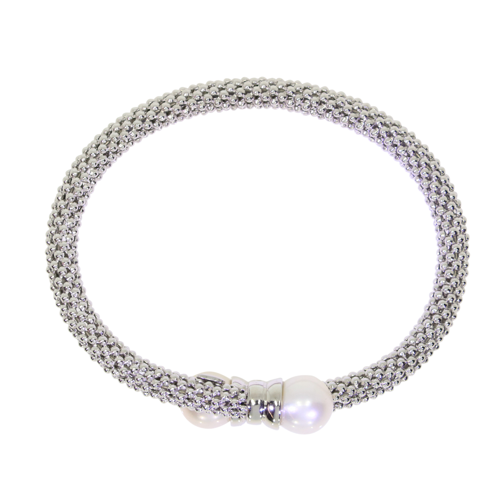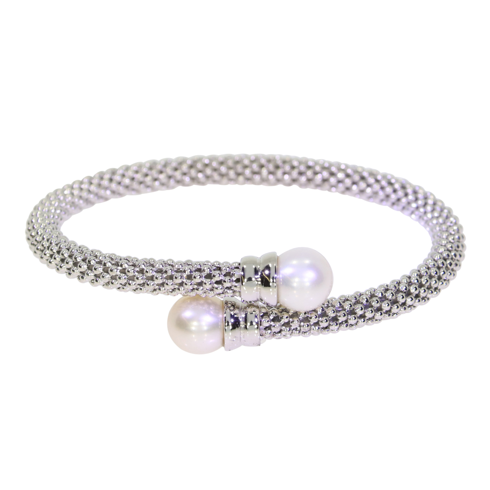 A sterling silver crossover bangle with Freshwater cultured pearl set ends.