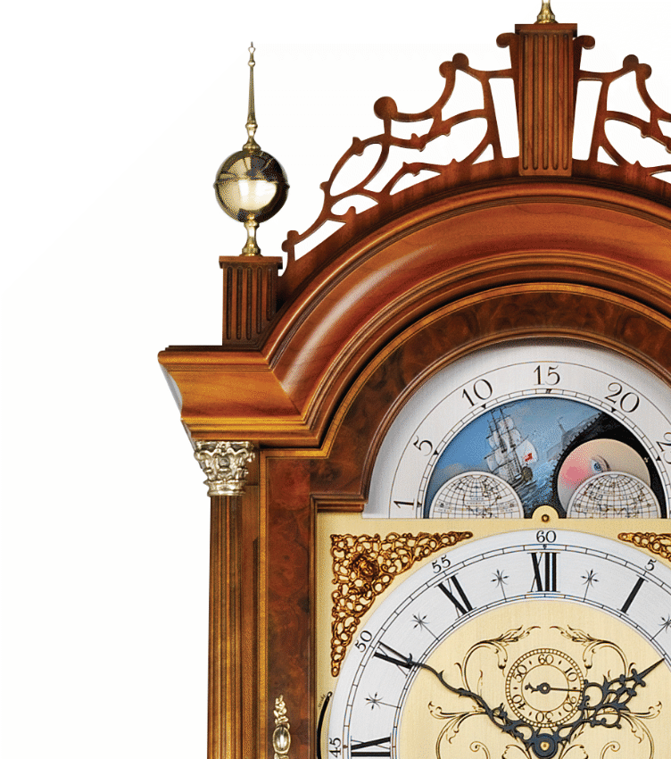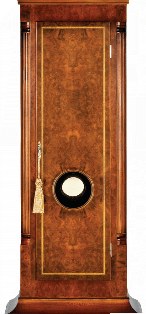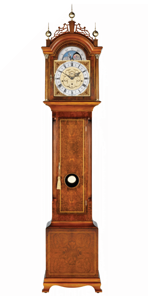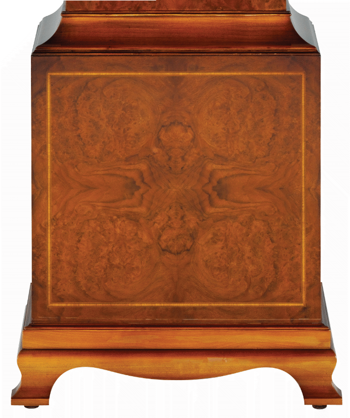 The cabinet of the Chatsworth is decorated with book matched burr veneers and inlaid with satinwood banding. The case features fluted quarter columns to the trunk and Corinthian pillars to the hood. The hood is removable to allow for movement adjustment. The cabinet is bleached, hand rubbed and waxed to achieve an antique patina.