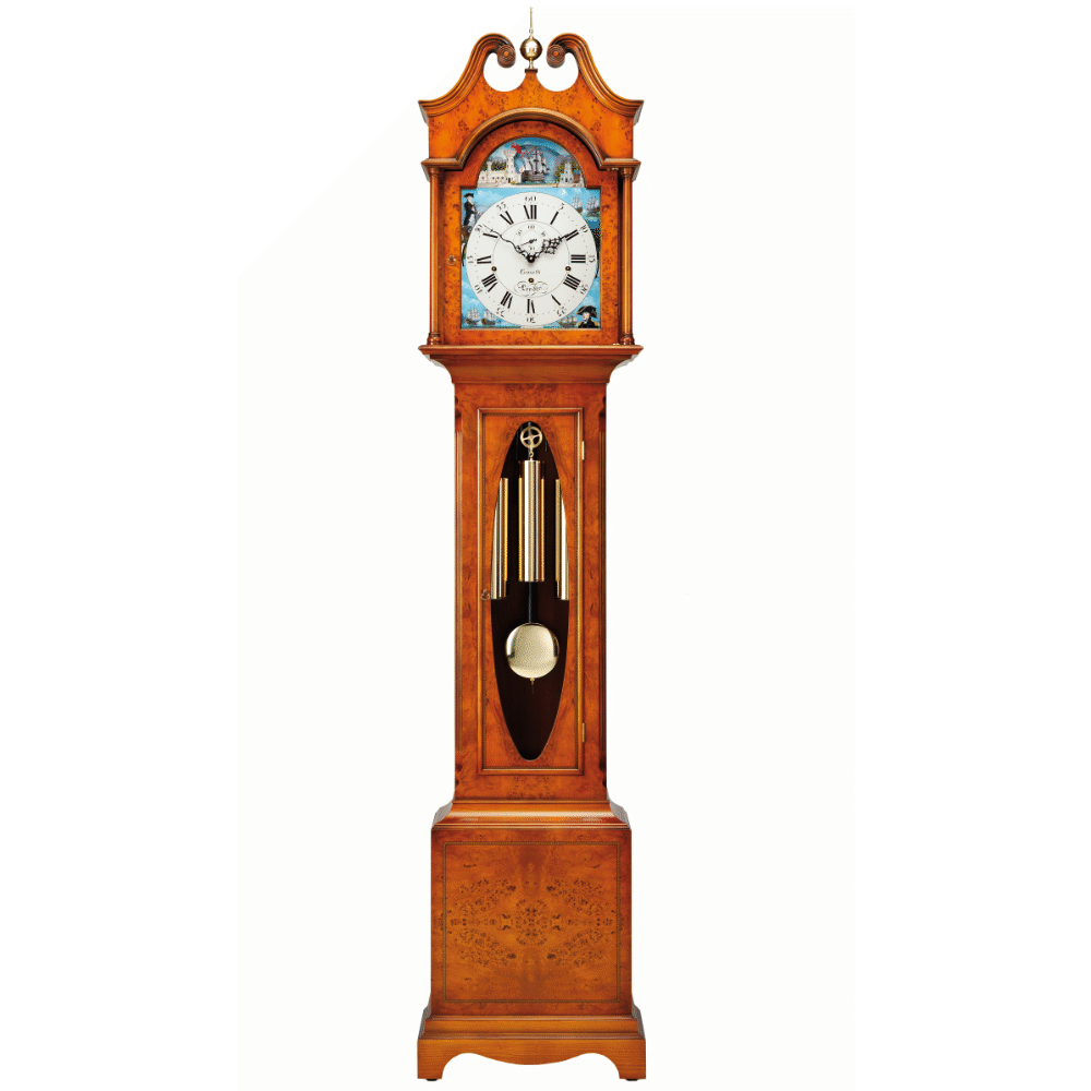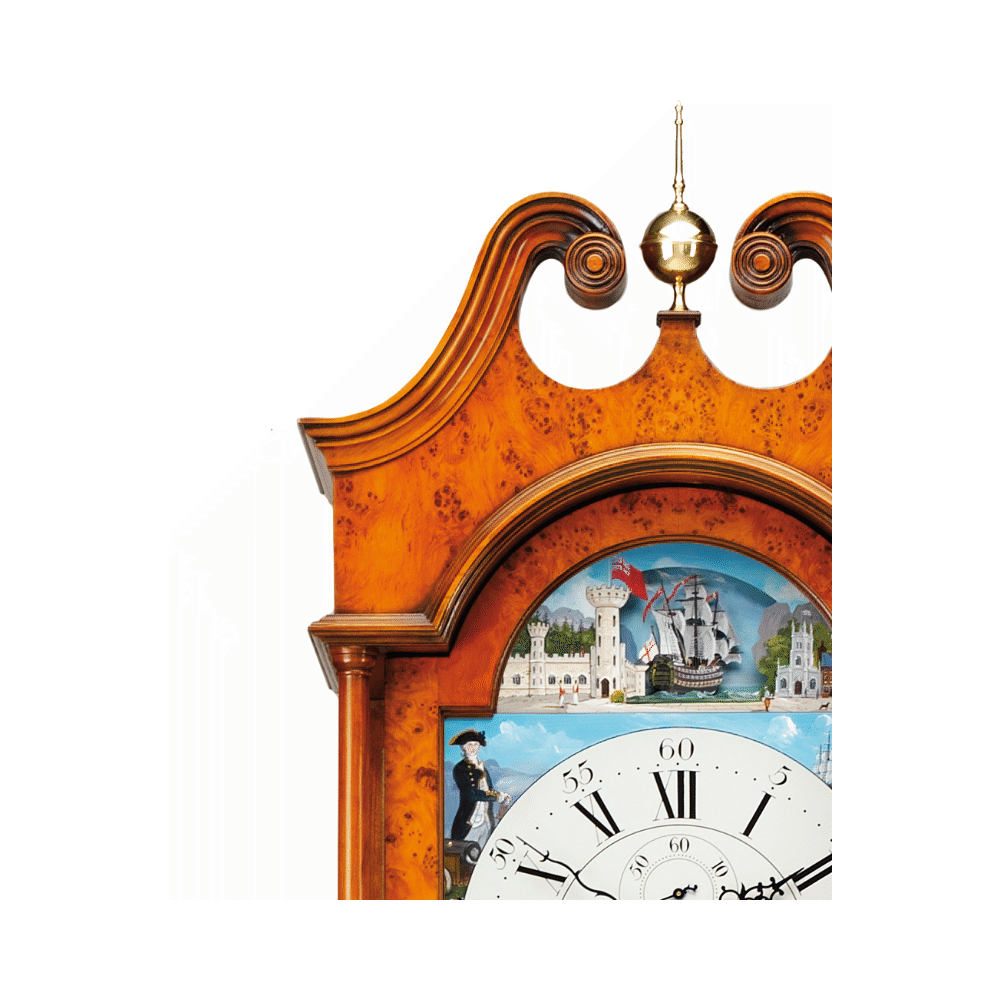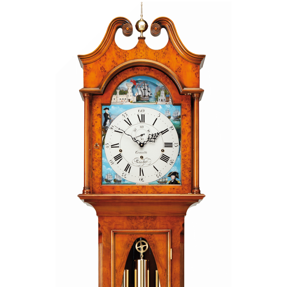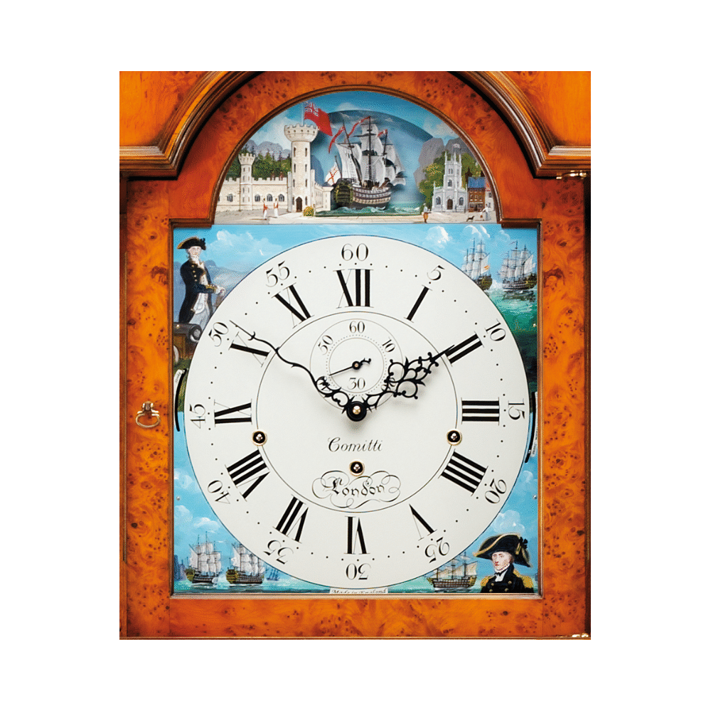 Content | Scroll top triple chime grandfather clock with a solid cherry cabinet decorated with book matched burr yew veneers inlaid with rope edgleline. The case us hand rubbed and waxed to achieve an antique patina.The clock features a hand painted dial celebrating the Battle of Trafalgar in 1805. Illustrated are Admiral Nelson, Captain Thomas Hardy and french and Spanish ships engaged in battle. The flagship HMS Victory rocks with the swing of the pendulum. Triple chime cable movement with silencer Automatic Night Shut off (10pm to 7.15am) Choice of hand painted dials or solid brass Westminster, St.Michael and Whittington melodies Delivered and set up by Comitti free of charge Size 203cm (80")High x 45cm (18") Wide x 30cm (12") Deep RRP £10,495.00 | |||||